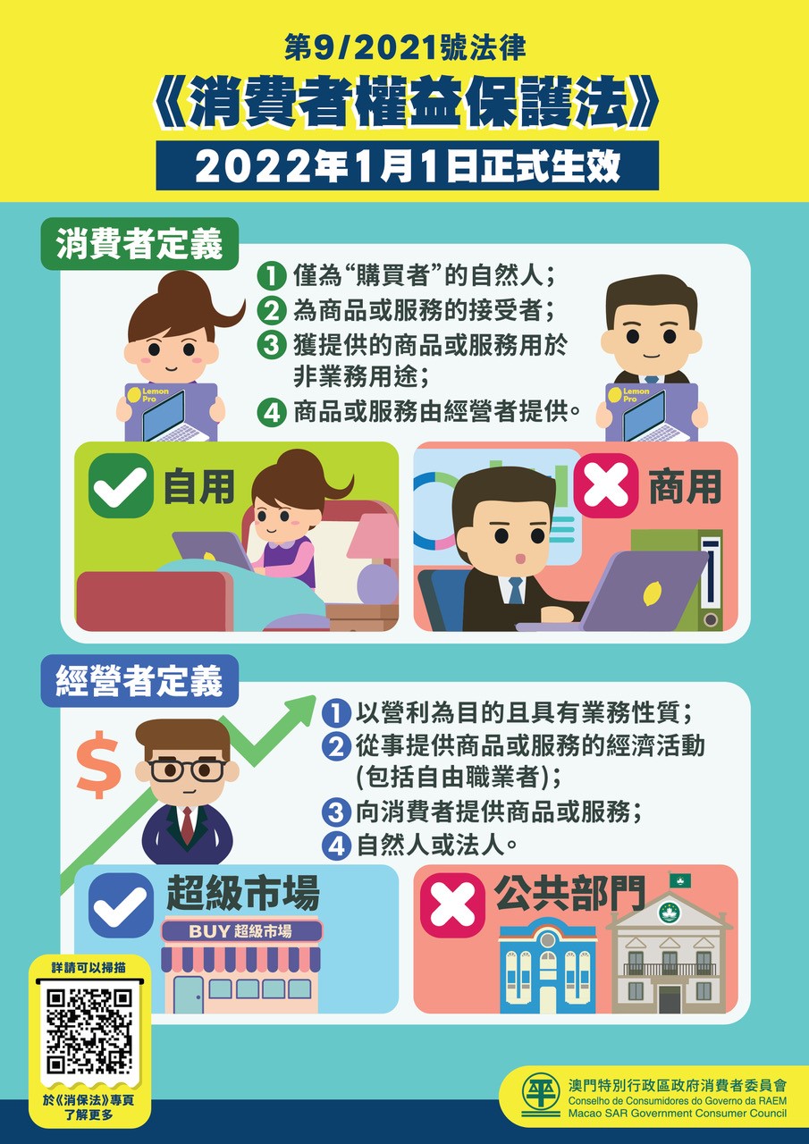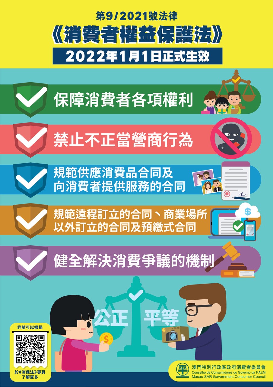 今(12)日出版的第28期《澳門特別行政區公報》第一組刊登第9/2021號法律《消費者權益保護法》,該法律於2022年1月1日起生效。