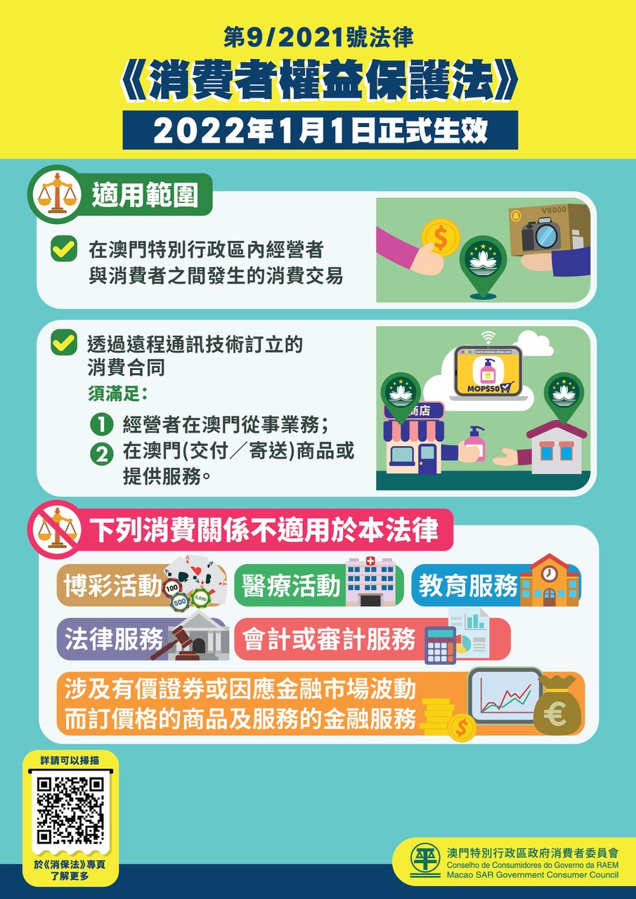 《消費者權益保護法》適用於澳門特別行政區內經營者與消費者之間因提供商品或服務建立的法律關係,法律不適用範圍包括幸運博彩、互動博彩、互相博彩或向公眾提供的博彩活動;醫療服務;教育服務;法律服務;會計或審計服務;涉及有價證券的金融服務或因應金融市場波動而訂定價格的商品及服務的金融服務。