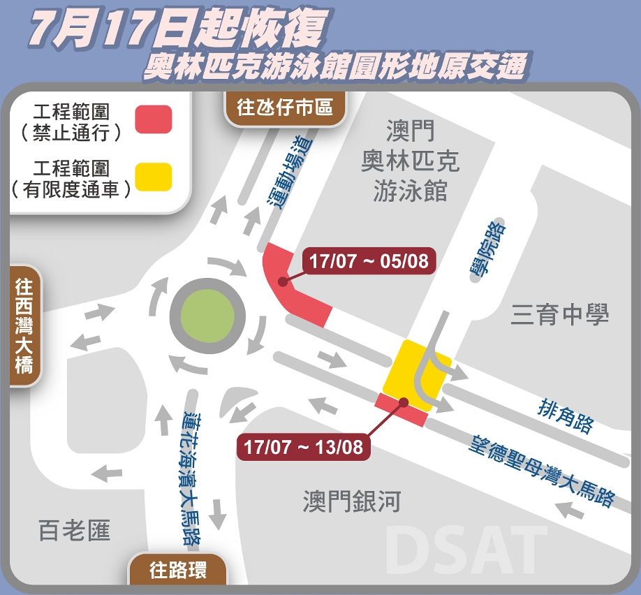 建設發展辦公室開展的「奧林匹克游泳館圓形地周邊路網重整」工程已接近尾聲,進度較預期理想,該圓形地可提前於7月17日(周六)起回復原有行車安排,圓形地的臨時交通燈同步取消。然而,周邊道路仍需進行回復路面工作而實施臨時交通安排,其中望德聖母灣大馬路近排角路路口會封閉,由望德聖母灣大馬路之來車須經圓形地往氹仔市區方向(相關臨時交通安排詳見附表)。