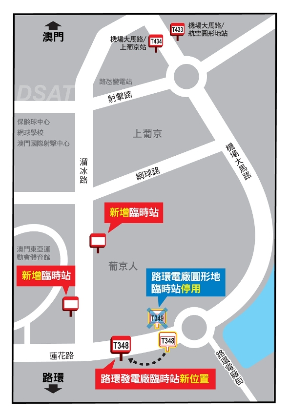 隨著路氹填海區的發展,溜冰路周邊多個大型酒店項目即將落成。為配合公眾出行需求,明日(17日)首班車起,巴士51、59路線臨時調整行程及停靠安排,詳情可參閱附表。