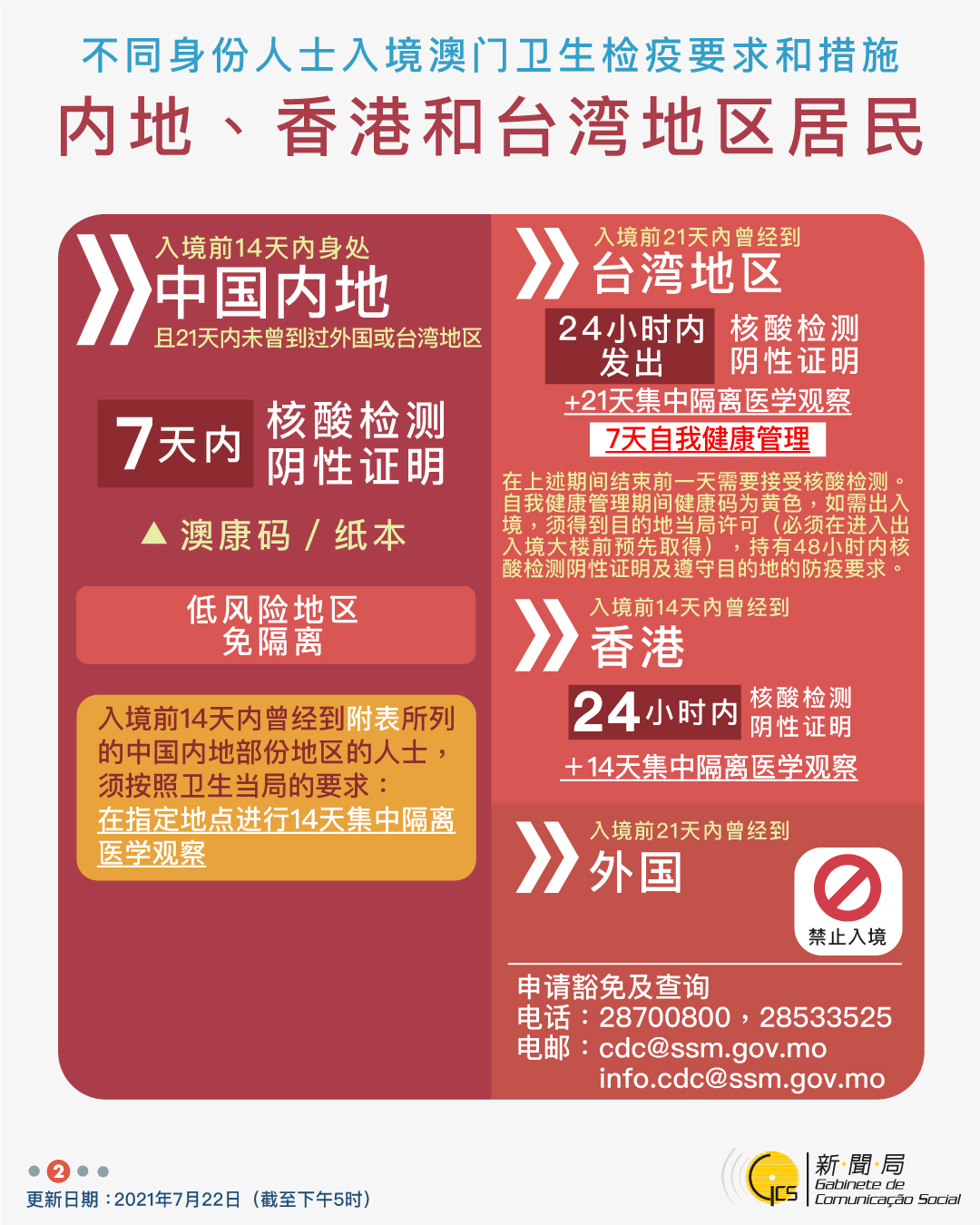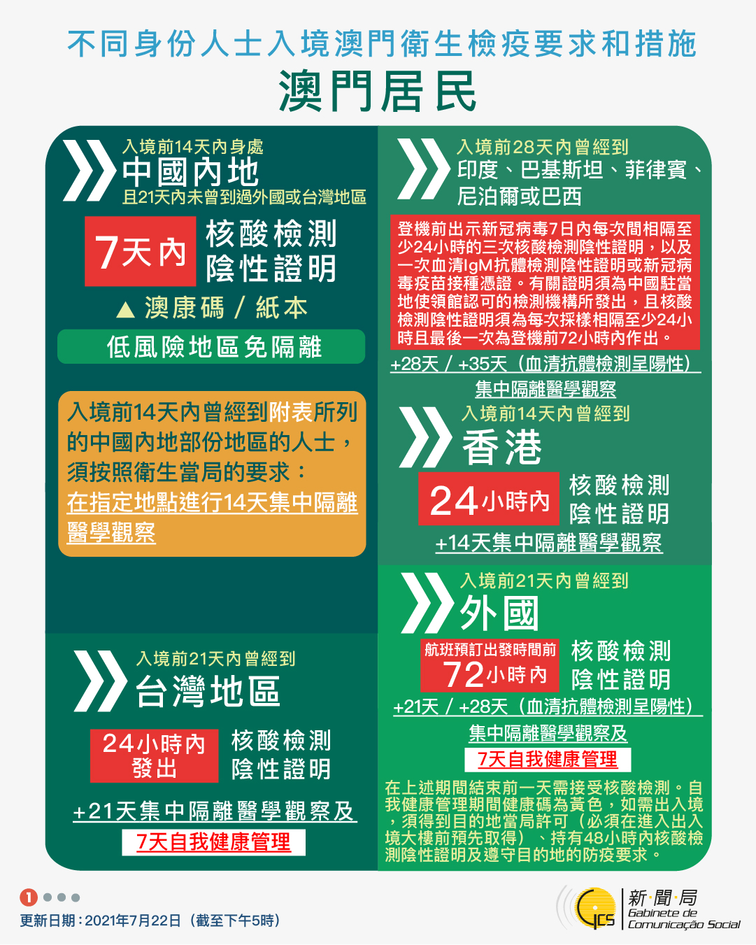 【圖文包】2021/7/22最新入境澳門衛生檢疫要求和措施