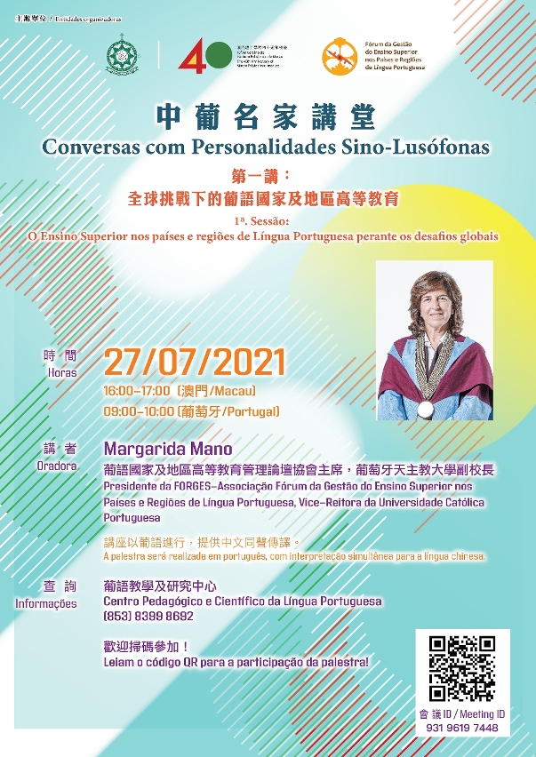 “中葡名家講堂” 系列講座第一場:“全球挑戰下的葡語國家及地區高等教育” 將於澳門當地時間7月27日16時/葡萄牙時間7月27日9時透過線上方式進行,現誠摯歡迎各界人士參與。本場講座以葡語進行,提供中文同聲傳譯,費用全免,掃描海報二維碼即可參加。如有垂詢,敬請致電澳門理工學院葡語教學及研究中心8399 8692。