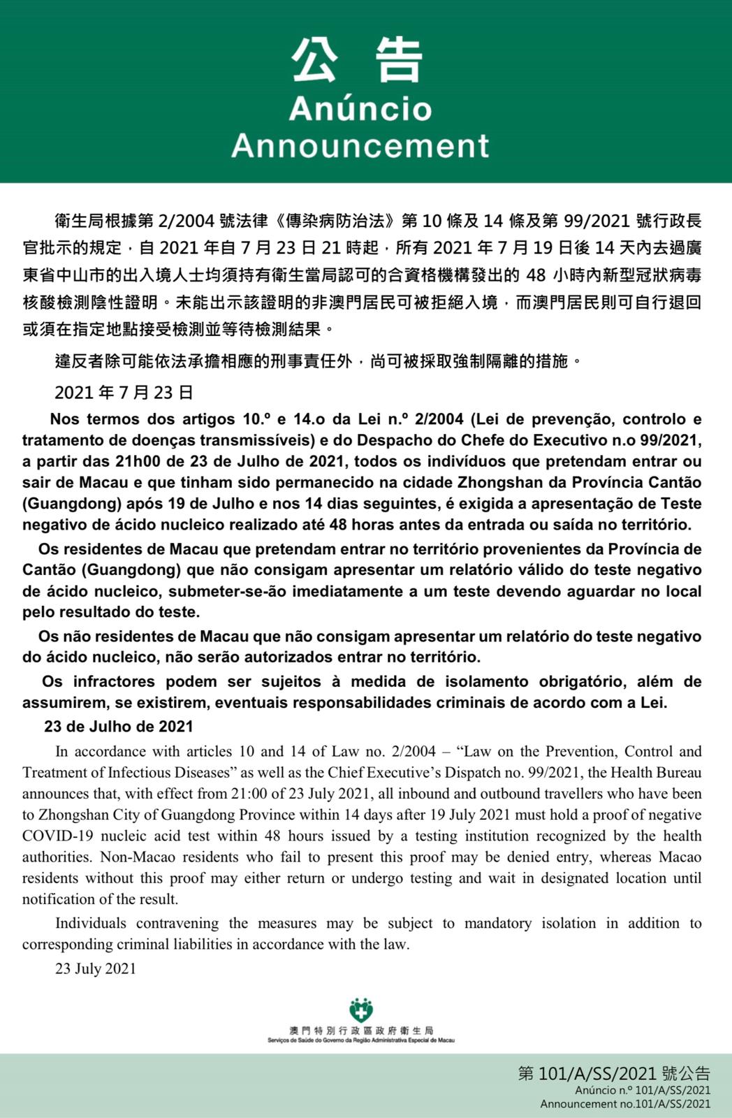 因應廣東省中山市疫情變化,為快速有效阻斷疫情擴散蔓延,新型冠狀病毒感染應變協調中心(下稱應變協調中心)表示,衛生局根據第2/2004號法律《傳染病防治法》第10條及第14 條及第 99/2021 號行政長官批示的規定,自7月23日21時起,所有2021年7月19日後14天內去過廣東省中山市的出入境人士,均須出示48小時內作出的核酸檢測陰性證明。未能出示該證明的非澳門居民可被拒絕入境,而澳門居民則可自行折返或須在指定地點接受檢測並等待檢測結果。
