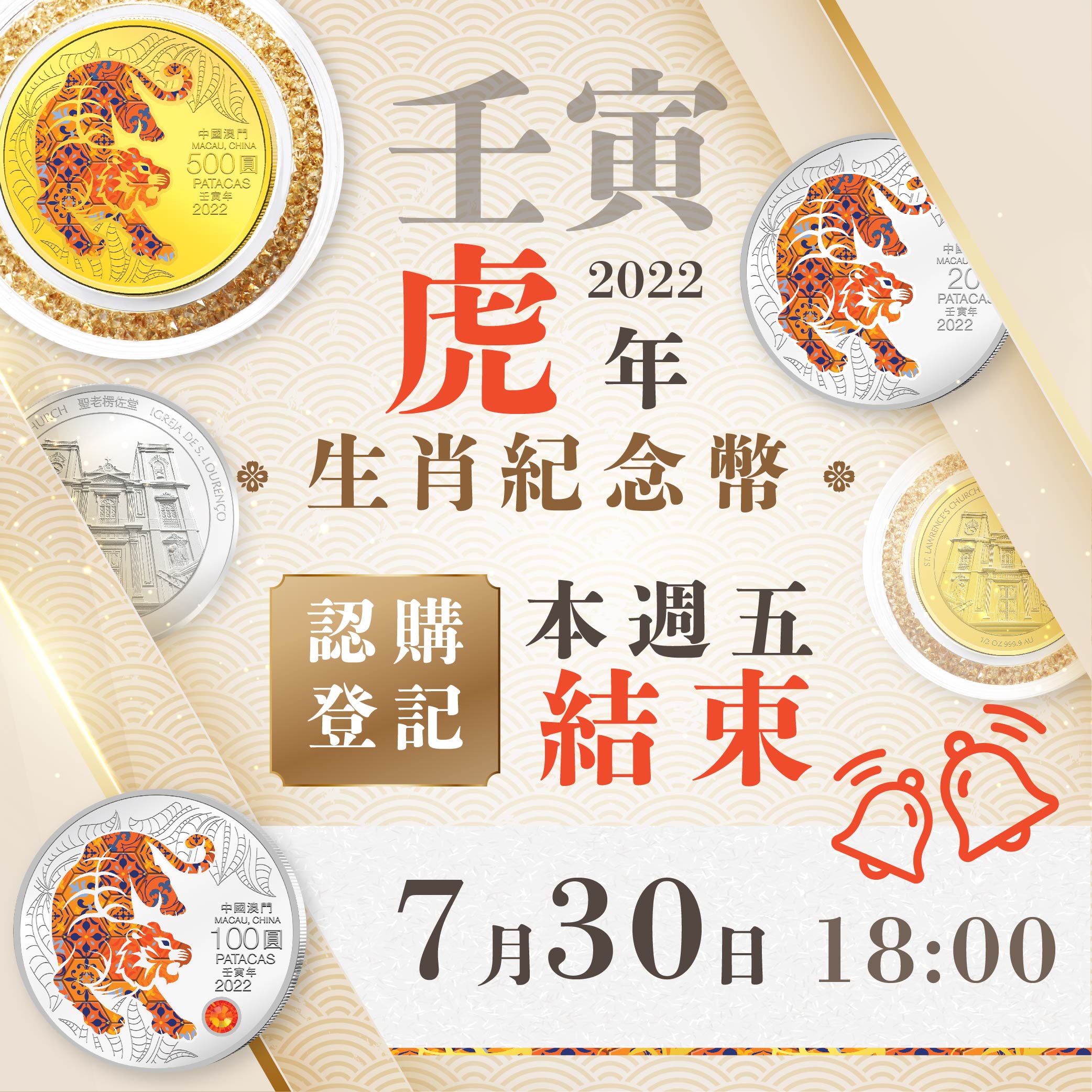 2022虎年生肖紀念幣網上認購登記將於7月30日(星期五)下午6時正結束,澳門金融管理局提醒有意認購的市民,儘快進行網上登記。