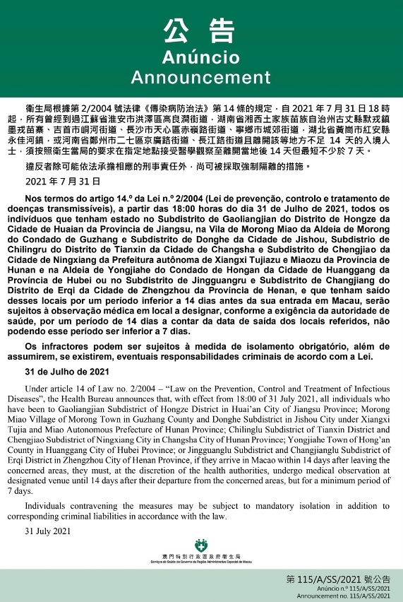 新型冠狀病毒感染應變協調中心宣佈,因應的江蘇省、湖南省、湖北省及河南省疫情變化,衛生局根據第2/2004號法律《傳染病防治法》第14條的規定,自2021年7月31日下午6時起,所有曾經到過江蘇省淮安市洪澤區高良澗街道,湖南省湘西土家族苗族自治州古丈縣默戎鎮墨戎苗寨、吉首市峒河街道、長沙市天心區赤嶺路街道、寧鄉市城郊街道,湖北省黃崗市紅安縣永佳河鎮,或河南省鄭州市二七區京廣路街道、長江路街道且離開該等地方不足14天的入境人士,須按照衛生當局的要求在指定地點接受醫學觀察至離開當地後14天但最短不少於7天。違反者除可能依法承擔相應的刑事責任外,尚可被採取強制隔離的措施。