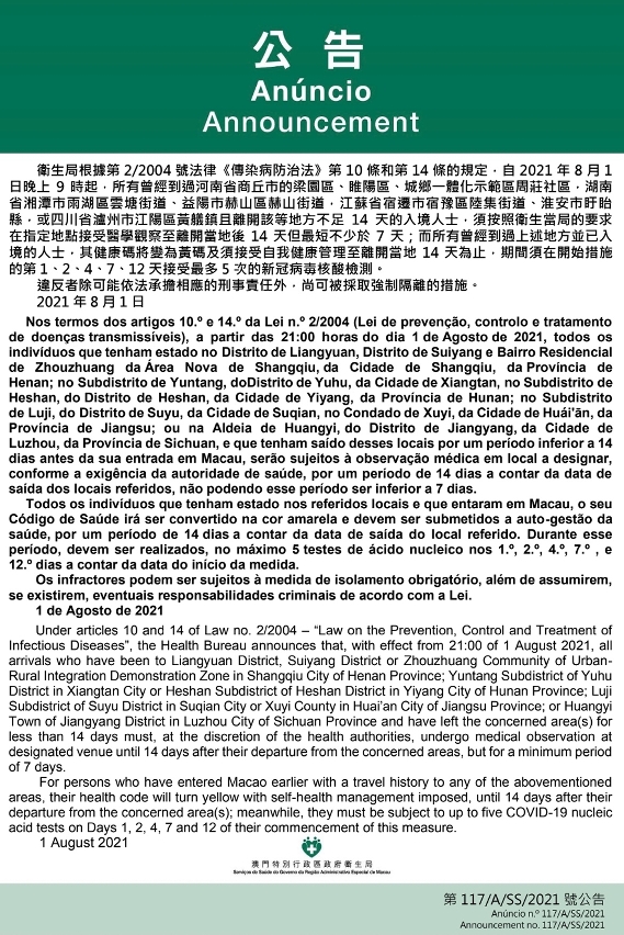 新型冠狀病毒感染應變協調中心宣佈,因應河南省、湖南省、江蘇省及四川省的疫情變化,衛生局根據第2/2004號法律《傳染病防治法》第10條和第14條的規定,自2021年8月1日晚上9時起,所有曾經到過河南省商丘市的梁園區、睢陽區、城鄉一體化示範區周莊社區,湖南省湘潭市雨湖區雲塘街道、益陽市赫山區赫山街道,江蘇省宿遷市宿豫區陸集街道、淮安市盱眙縣,或四川省瀘州市江陽區黃艤鎮且離開該等地方不足14天的入境人士,須按照衛生當局的要求在指定地點接受醫學觀察至離開當地後14天但最短不少於7天;而所有曾經到過上述地方並已入境的人士,其健康碼將變為黃碼及須接受自我健康管理至離開當地 14 天為止,期間須在開始措施的第 1、2、4、7、12 天接受最多 5 次的新冠病毒核酸檢測。免費核酸檢測預約連結為https://app.ssm.gov.mo/mandatoryrnatestbook。核酸檢測結果不會上載至澳門健康碼亦不可作為出入境用途。如需將核酸檢測結果在澳門健康碼顯示,則須自費檢測。