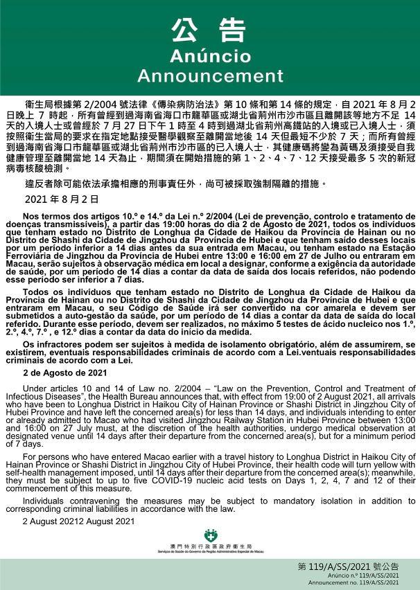 新型冠狀病毒感染應變協調中心宣佈,因應海南省及湖北省的疫情變化,衛生局根據第2/2004號法律《傳染病防治法》第10條和第14條的規定,自2021年8月2日晚上7時起,所有曾經到過海南島省海口市龍華區或湖北省荊州市沙市區且離開該等地方不足14天的入境人士、曾經於7月27日下午1時至4時到過荊州高鐵站的入境或已入境人士,須按照衛生當局的要求在指定地點接受醫學觀察至離開當地後14天但最短不少於7天;而所有曾經到過海南島省海口市龍華區或湖北省荊州市沙市區的已入境人士,其健康碼將變為黃碼及須接受自我健康管理至離開當地 14 天為止,期間須在開始措施的第 1、2、4、7、12 天接受最多 5 次的新冠病毒核酸檢測。而所有曾經到過上述地方並已入境的人士,免費核酸檢測預約連結為https://app.ssm.gov.mo/mandatoryrnatestbook。核酸檢測結果不會上載至澳門健康碼亦不可作為出入境用途。如需將核酸檢測結果在澳門健康碼顯示,則須自費檢測。