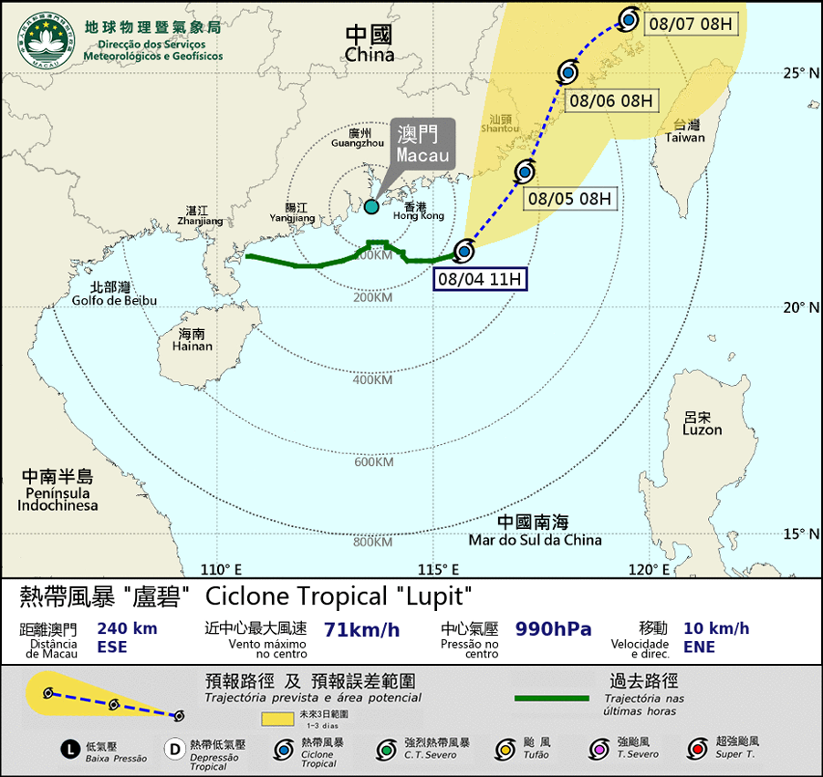 位於南海北部的熱帶低氣壓已增強為熱帶風暴,並命名為「盧碧」。預料「盧碧」將進一步遠離本澳,大致趨向廣東東部至福建沿岸一帶。當「盧碧」進一步遠離,對本澳的威脅降低,本局將考慮取消所有熱帶氣旋信號。