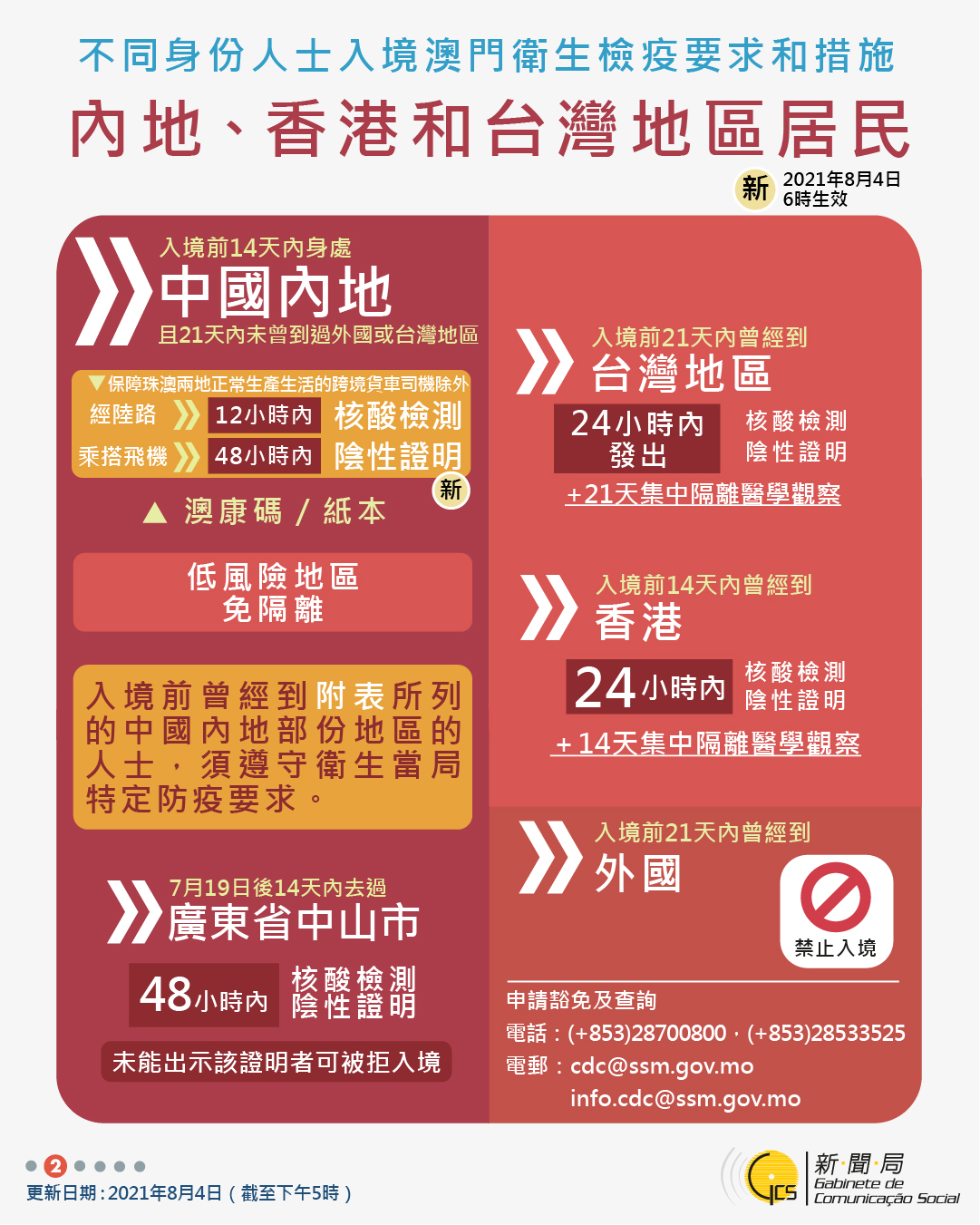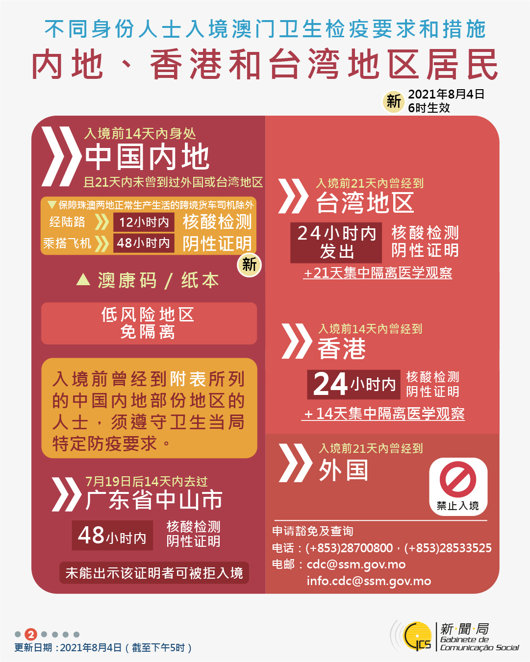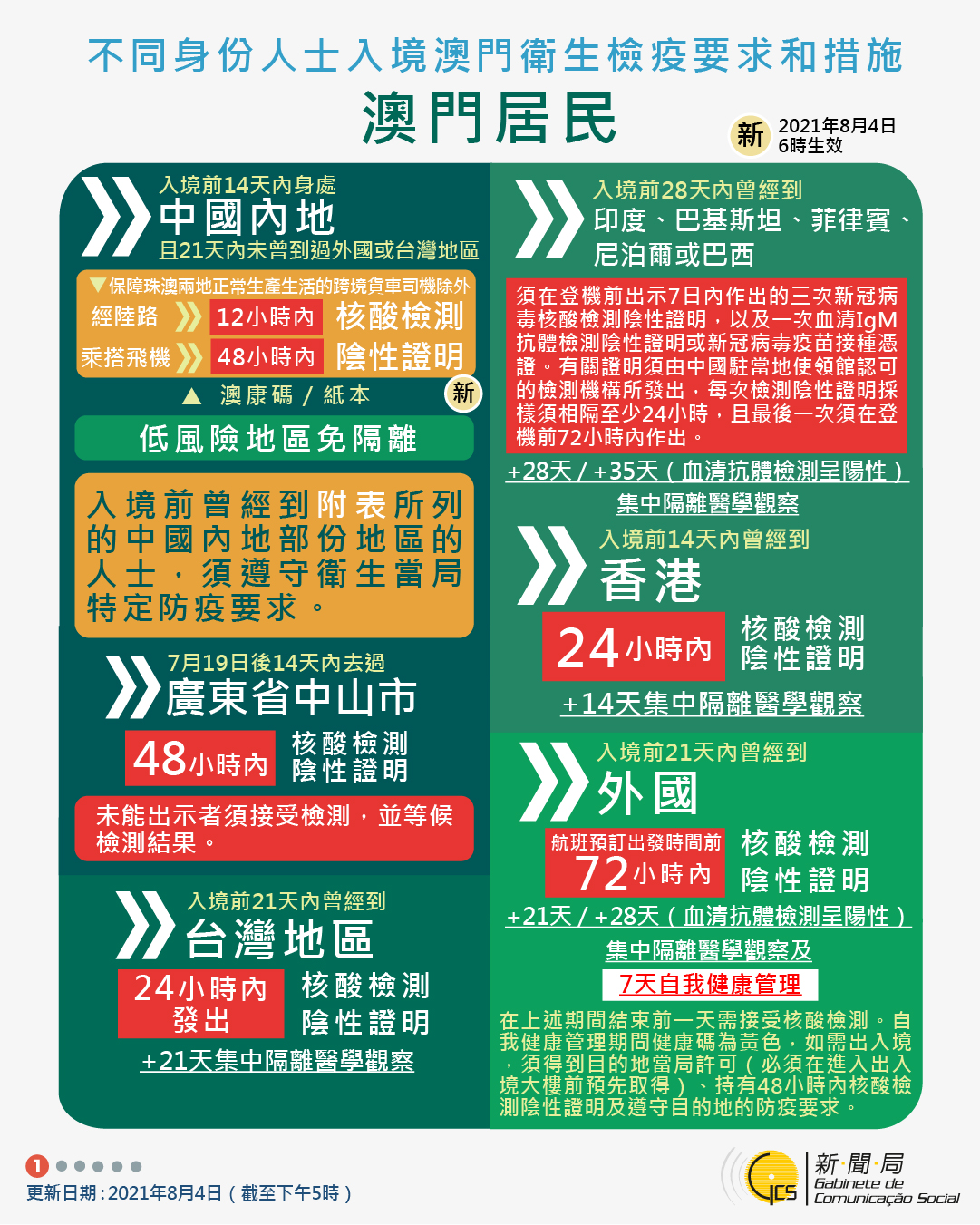 【圖文包】2021/8/4最新入境澳門衛生檢疫要求和措施