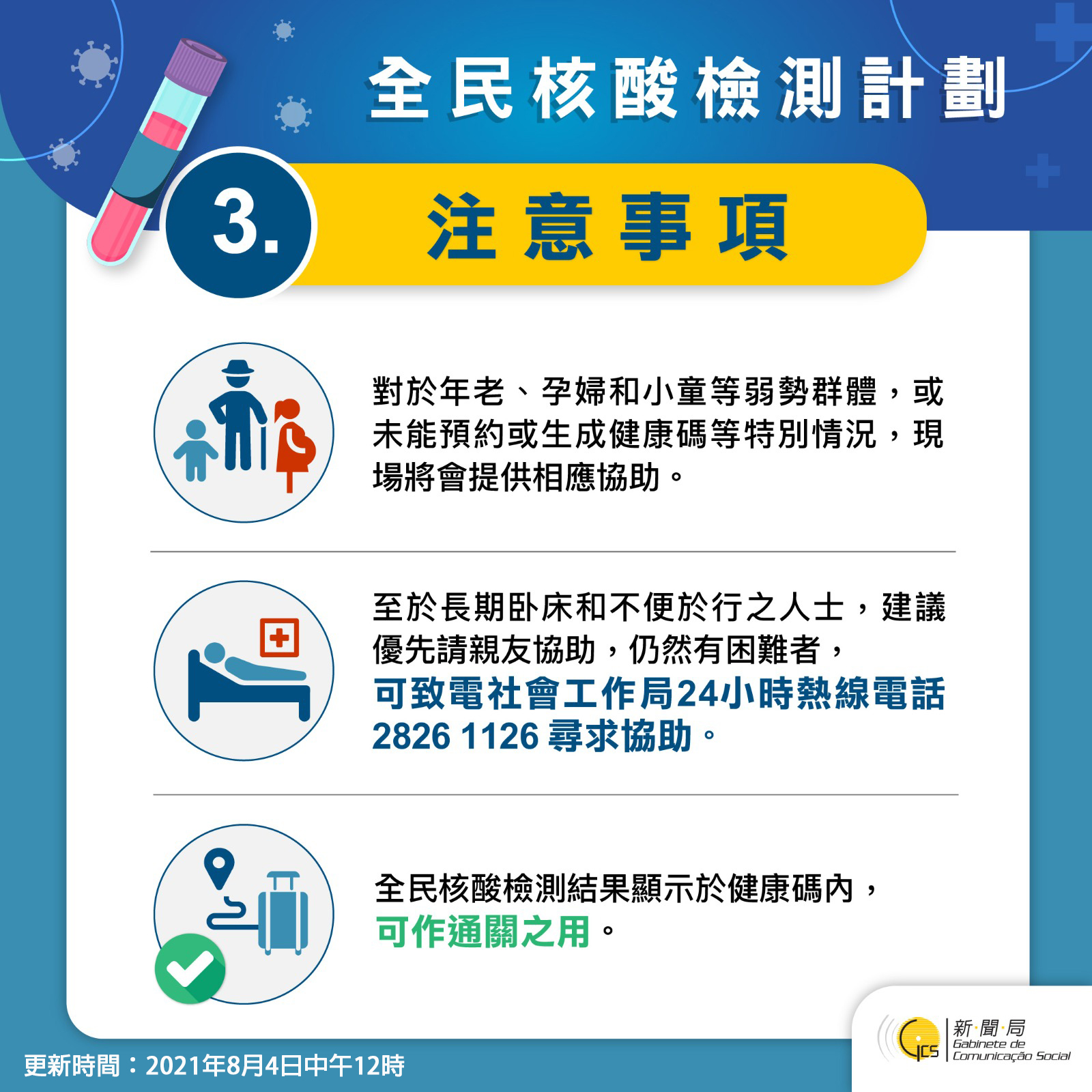 然而,應變協調中心再次呼籲,居民如非必要,請不要離境,不要前往人群聚集的地方;所有澳門居民如果出現不適,如喉嚨痛、咳嗽、發燒等症狀,應儘快求診,並做好個人衛生措施,出外戴好口罩。