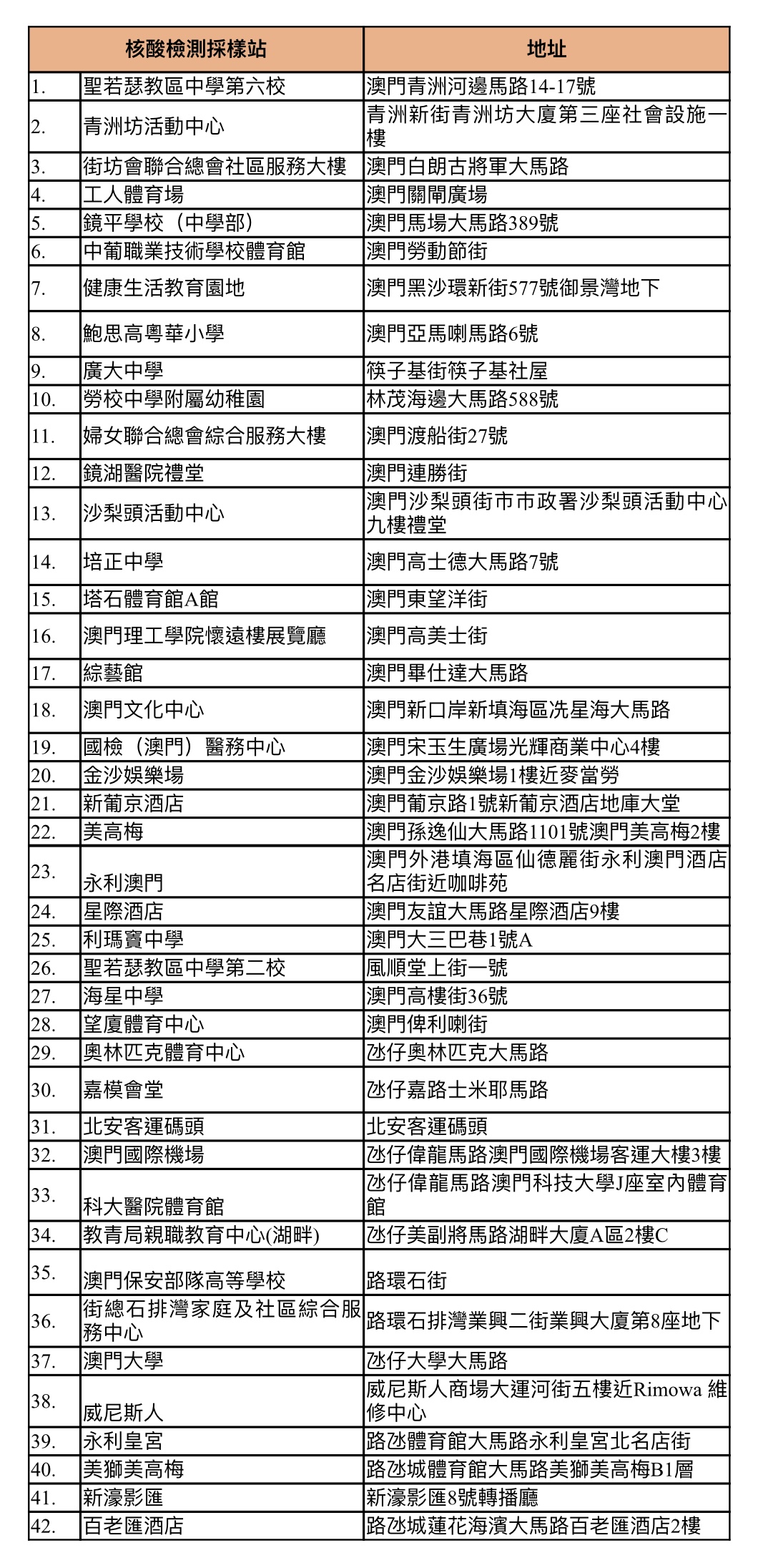 現時全澳共設有42個核酸站,其中澳門28個、路氹14個。見下表:
