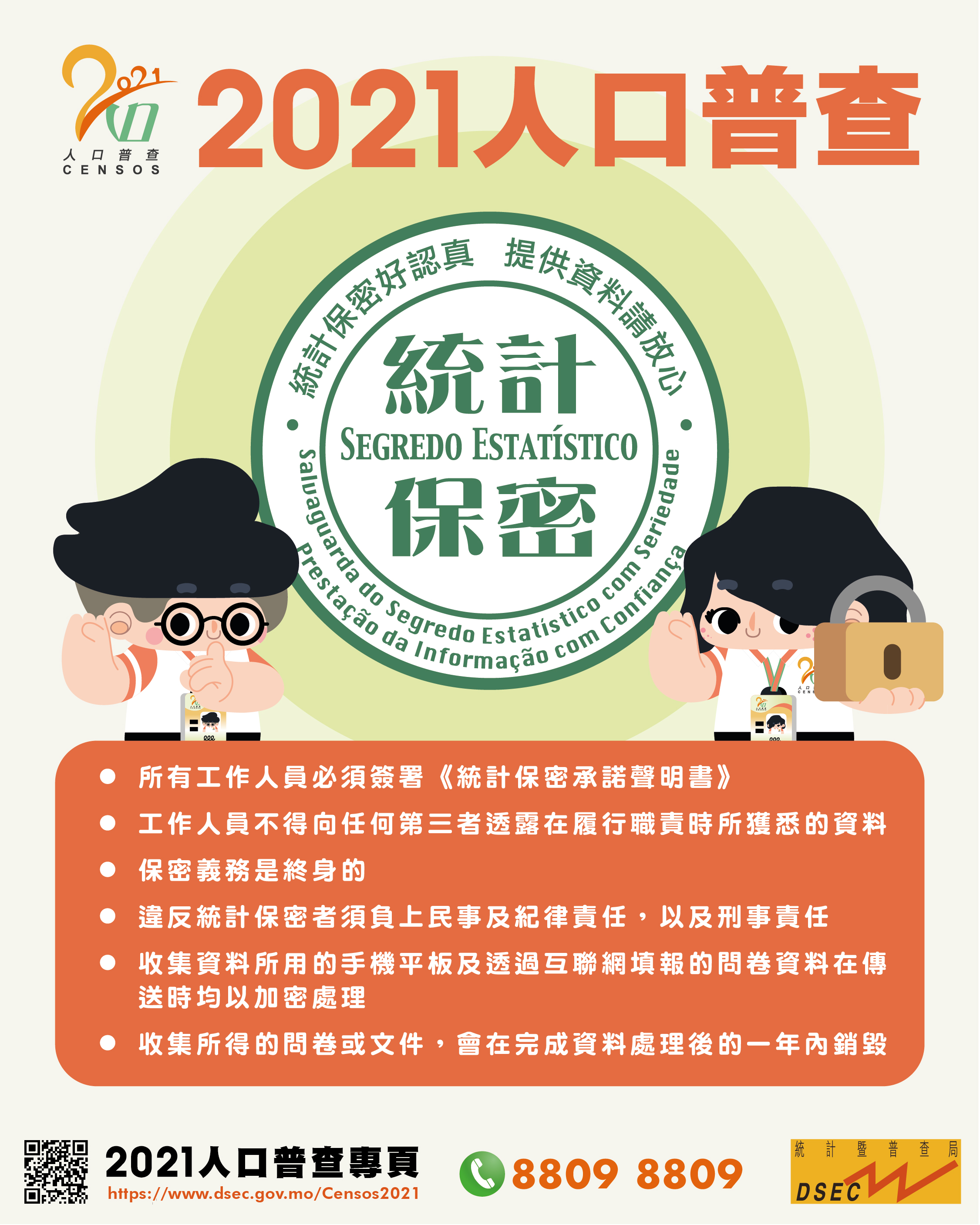 根據第6/2021號行政法規《二零二一人口普查制度》,所有普查對象必須在規定期限內提供所需的資料。此外,根據第242/GM/99號批示《統計保密規章》的規定,統計局必須對受訪者提供的資料絕對保密,數據在匯總處理後僅以整體形式公佈,不會顯示任何住戶的個人信息。