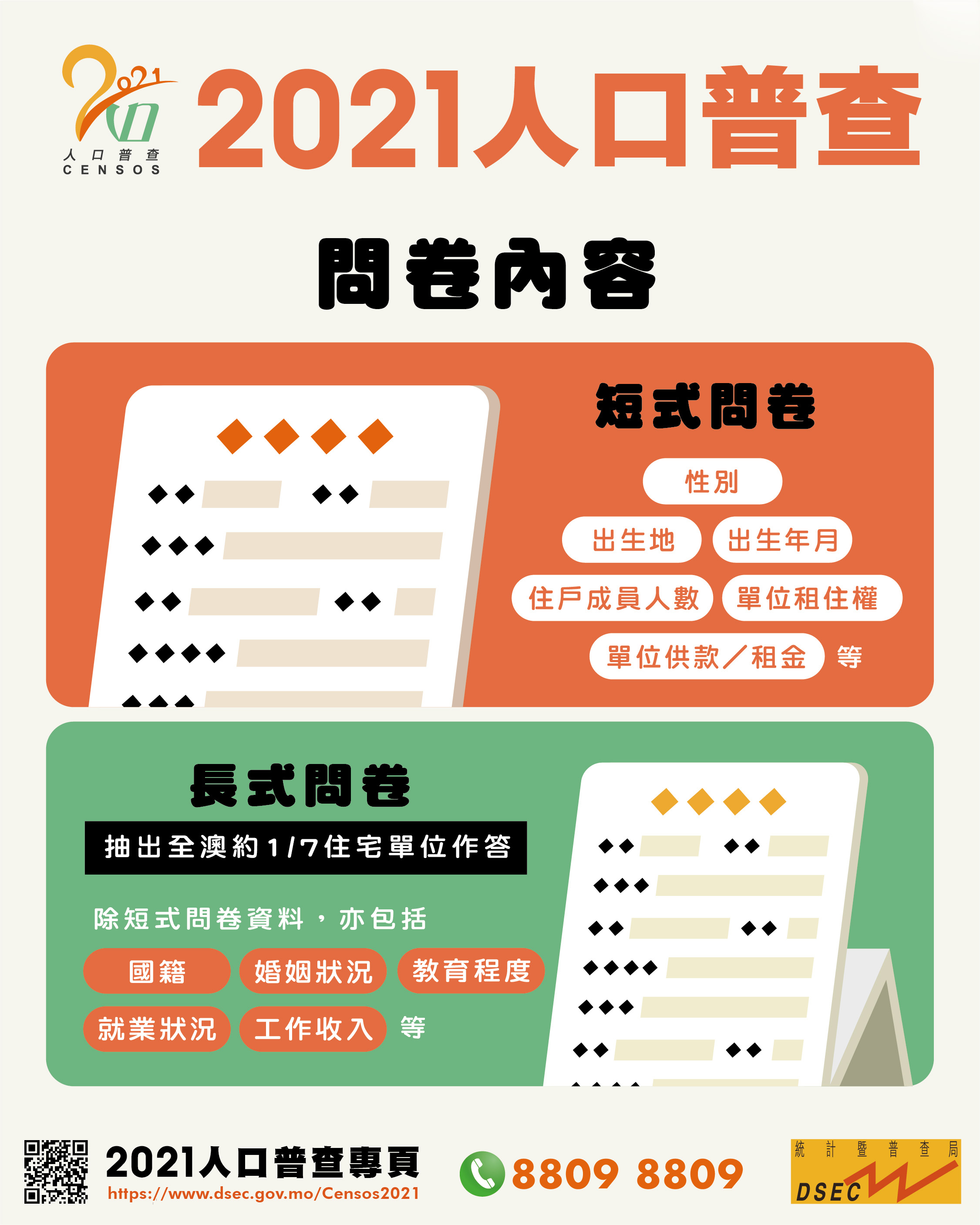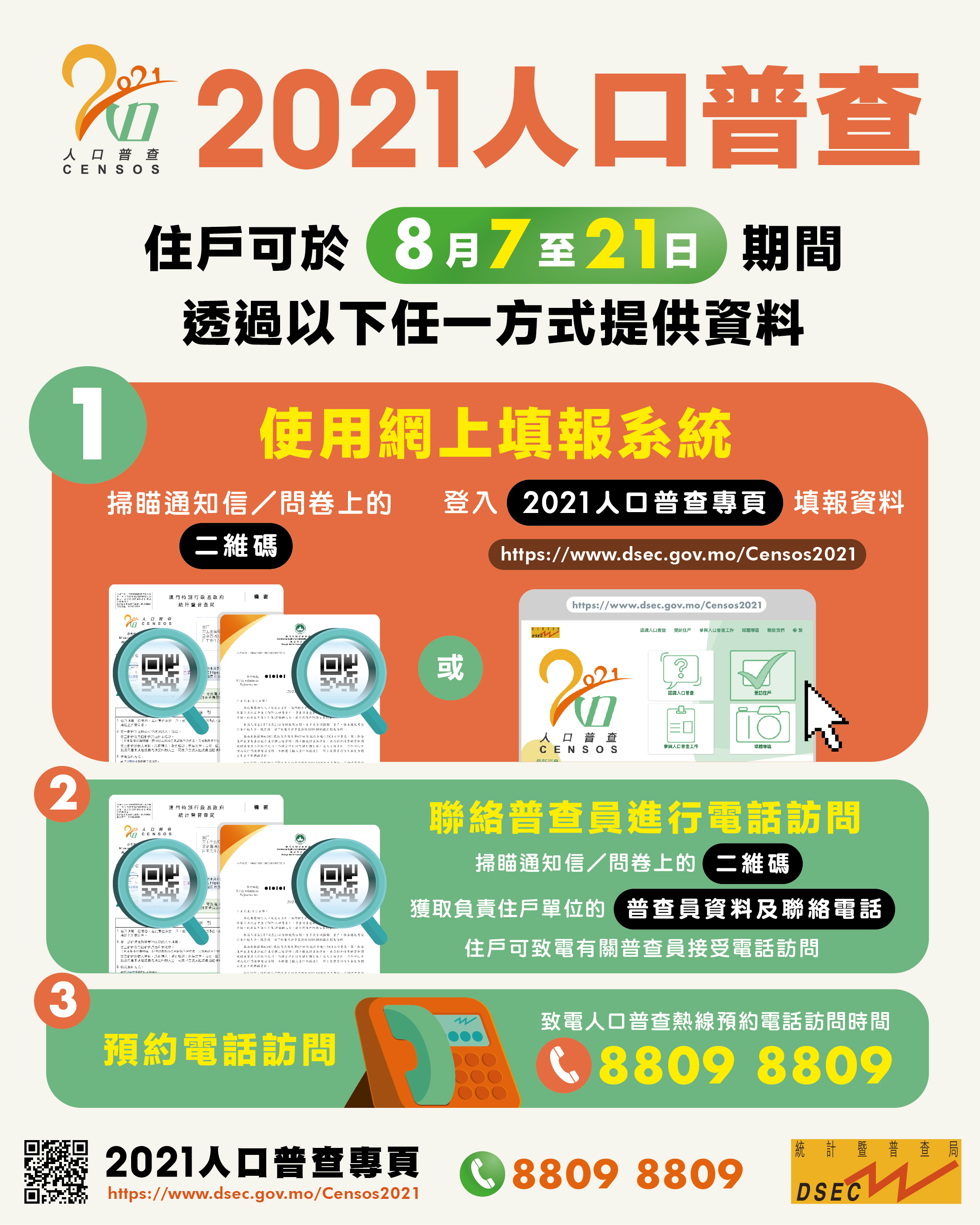 有關人口普查詳情,請瀏覽2021人口普查專頁(https://www.dsec.gov.mo/Censos2021),或致電人口普查熱線8809 8809查詢。