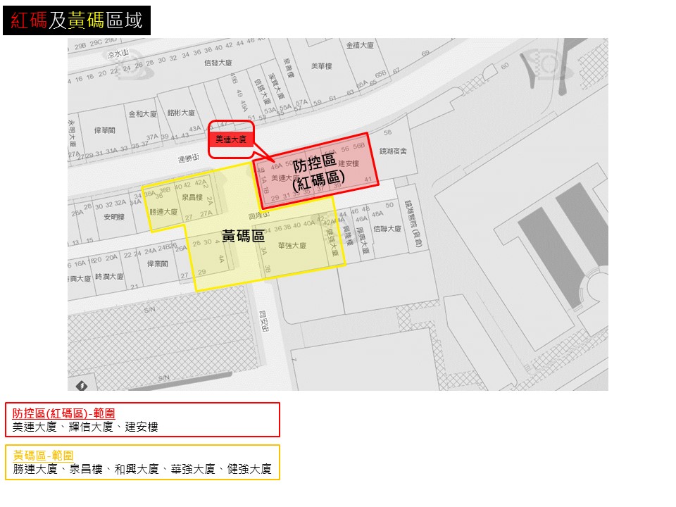 而劃分為黃碼區(共同管理區)的大廈包括對與防控區三幢大廈鄰近的勝連大廈、泉昌樓、和興大廈、華強大廈和健強大廈五座樓宇採取共同措施,實施健康碼黃碼管制,相關區內人士的健康碼轉為黃碼,並於指定地點(鏡湖醫院)進行核酸檢測,首次核酸檢測24小時內完成,並視乎需要而再要求核酸檢測,其他限制措施包括實施離境限制,並需進行最少14天的密切健康監測及自我健康管理。
