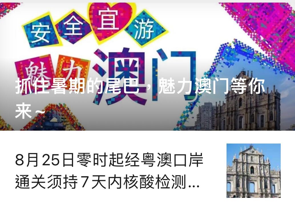 因應新型冠狀病毒感染應變協調中心於23日宣佈,8月25日零時起,經粵澳口岸出入境人士,改為須持7天內核酸測試陰性結果證明,旅遊局積極宣傳有關資訊,歡迎內地旅客來澳門旅遊。