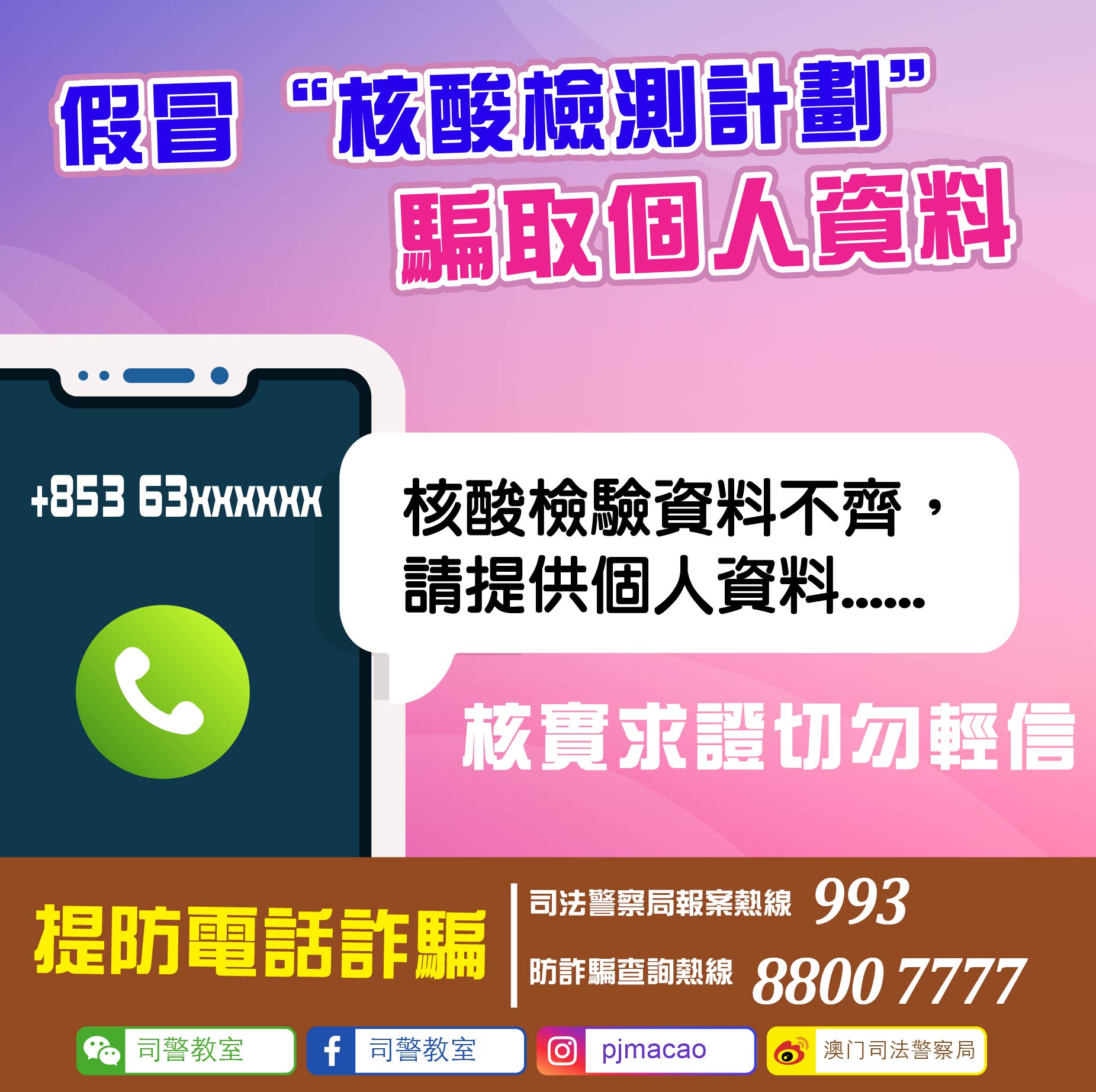 司法警察局今(25)日接獲市民反映,稱收到來電顯示為+853開頭的陌生電話,對方自稱為新型冠狀病毒核酸檢測工作人員,指事主的檢測登記資料不足,要求事主提供個人身份資料。事主認為其電話號碼可疑,懷疑對方假冒政府檢疫人員行騙,故拒絕提供資料並立即掛線。
