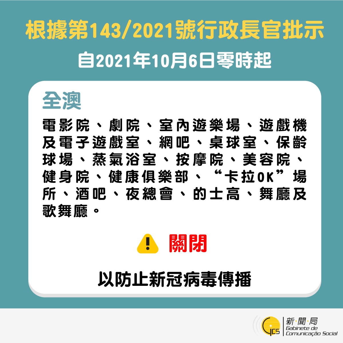 本澳部份娛樂場所將於10月6日凌晨起關閉