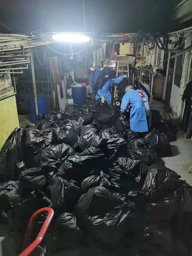 維生及支援小組於區域圍封當天已向新美安大廈居民派發指引,要求住戶將生活垃圾妥善包紮以確保不滲漏,於每晚六時至八時前放置於單位門前。市政署每晚派出至少七名衛生人員於九時後上門收集生活垃圾,並對梯間走廊進行清潔,平均每晚清理超過一百袋大垃圾袋,可裝滿十個一千一百公升的大型垃圾桶,平均需要至少五小時。惟近日發現有部份住戶不按指引依時棄置垃圾,亦於大廈天井平台等公共部份棄置垃圾及雜物,當中包括大型廢舊家具、床舖、煮食爐具、裝修廢棄物以及未有妥善包好的廚餘及口罩等,嚴重損害環境衛生,加重清運負擔。