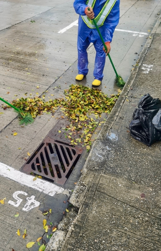 風球懸掛期間市政署派員處理堵塞排水口落葉,疏通路面積水