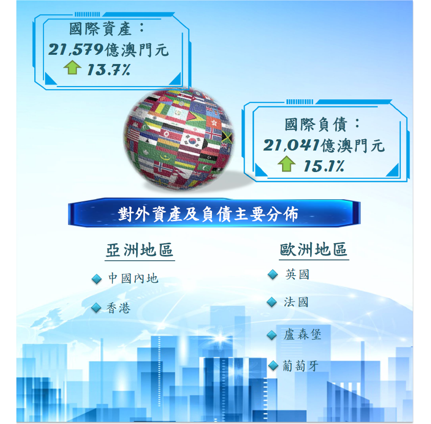 澳門的國際性銀行業務主要分佈在亞洲及歐洲。至2021年9月底,澳門銀行體系對外資產中,對中國內地及香港的債權各佔43.4%及28.1%;而對盧森堡及葡萄牙的債權均佔0.9%。與此同時,對葡語國家及“一帶一路”沿線國家的債權比重分別為1.3% 及 8.0%。在對外負債方面,對中國內地及香港的負債各佔總體對外負債的39.8% 及36.0%;對英國及法國的負債則各佔5.0% 及4.2%;而對葡語國家及“一帶一路”沿線國家的負債比重分別為0.6% 及7.6%。