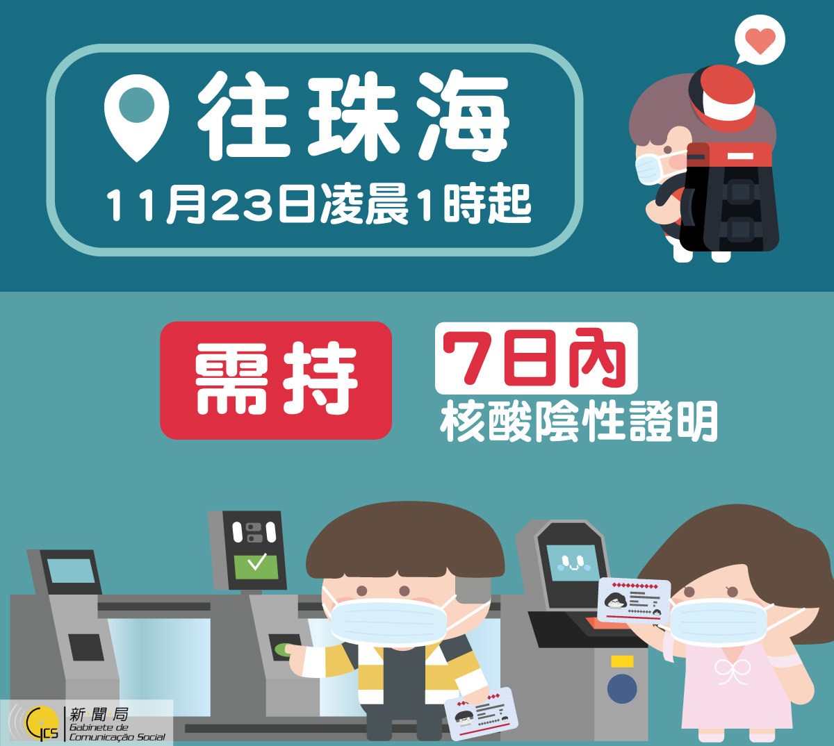 自2021年11月23日凌晨1時起,經珠澳口岸入境(珠海)人員需持7日內核酸檢測陰性結果證明。