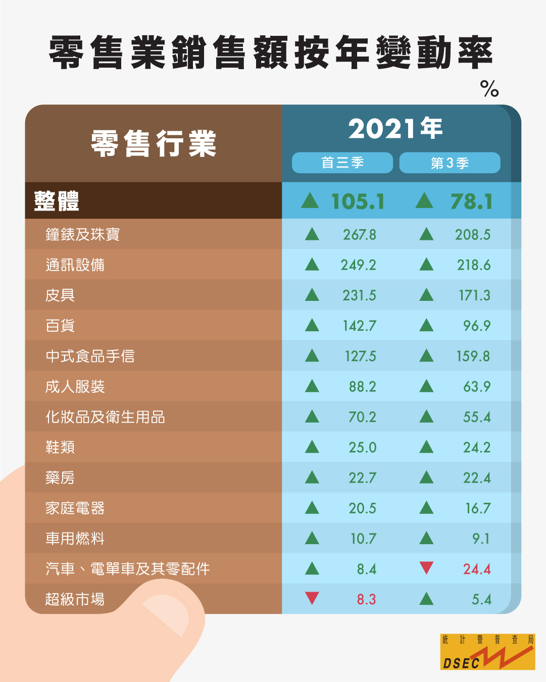 與去年同季比較,主要零售行業中通訊設備(+218.6%)、鐘錶珠寶(+208.5%)、皮具(+171.3%)和百貨(+96.9%)的銷售額均錄得明顯升幅,而汽車(-24.9%)則下跌。銷貨量指數方面,按年升幅較大的同樣為通訊設備(+241.2%)、鐘錶珠寶(+215.7%)、皮具(+181.3%)和百貨(+102.5%),汽車(-24.0%)則錄得跌幅。首三季零售業銷售額按年上升超過一倍至554.5億元,與2019年同期(564.4億元)比較僅減少1.8%,基本回復至疫情前水平;銷售額上升主要由皮具、通訊設備及鐘錶珠寶銷售增加所帶動。首三季銷貨量指數與2020年及2019年同期比較分別上升115.7%及3.9%。