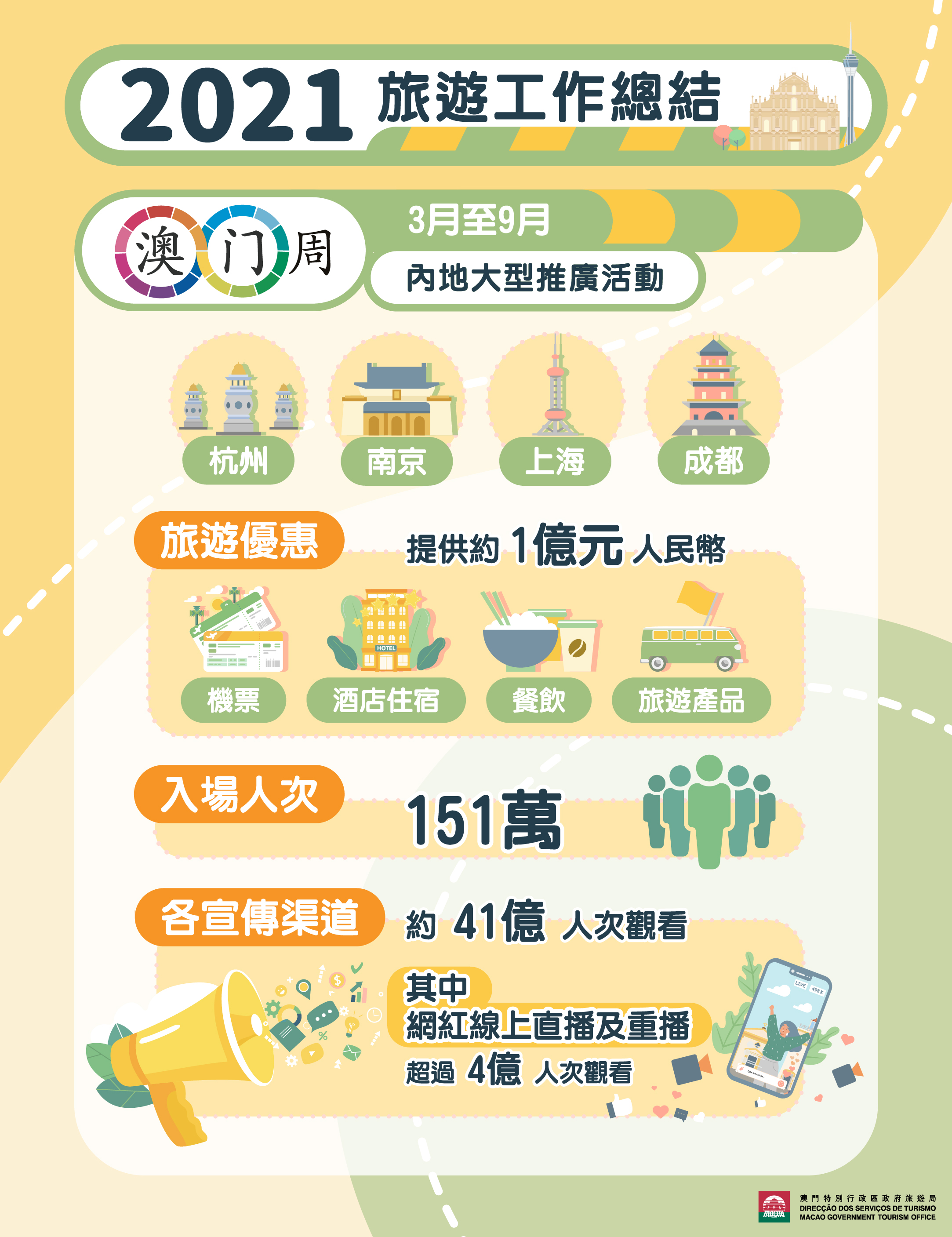 在嚴格遵循防疫指引下,旅遊局在澳門及內地舉辦多項大型盛事活動,包括在不同城市舉辦“澳門周”,有序開展連串線上線下旅遊推廣工作。另外,旅遊局持續部署精彩盛事和支持社團業界鋪開社區活動。