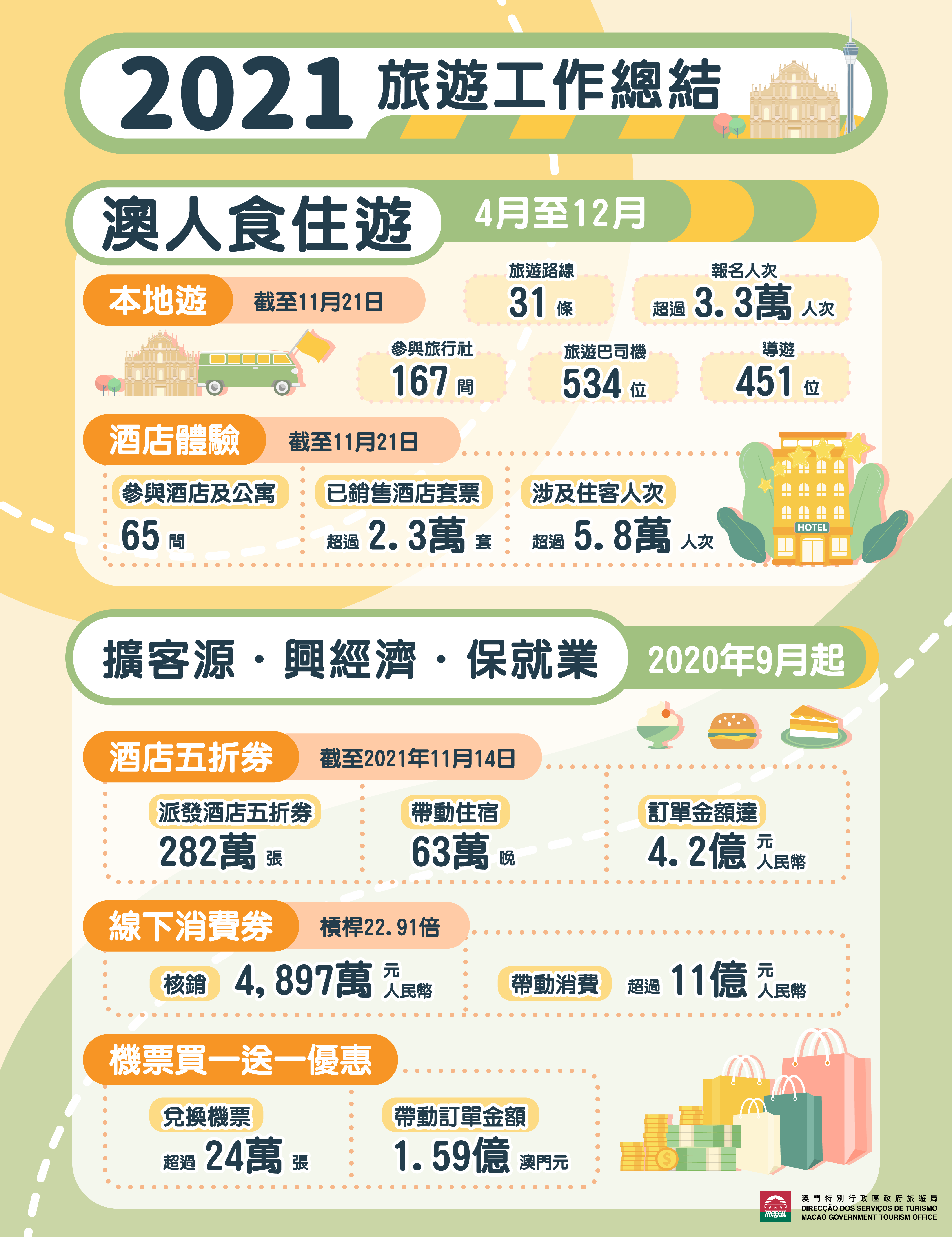 旅遊局與業界於4月至12月推出“澳人食住遊”計劃,繼續透過“以工代賑”方式為旅遊業界創造就業機會,並藉此促進內需及帶動社區消費,推動旅遊及相關行業復甦。此外,旅遊局創設條件,協助業界推出面向旅客的“澳門精品遊”路線,亦可通過獨立包團形式私人定製路線,提升來澳旅遊體驗。
