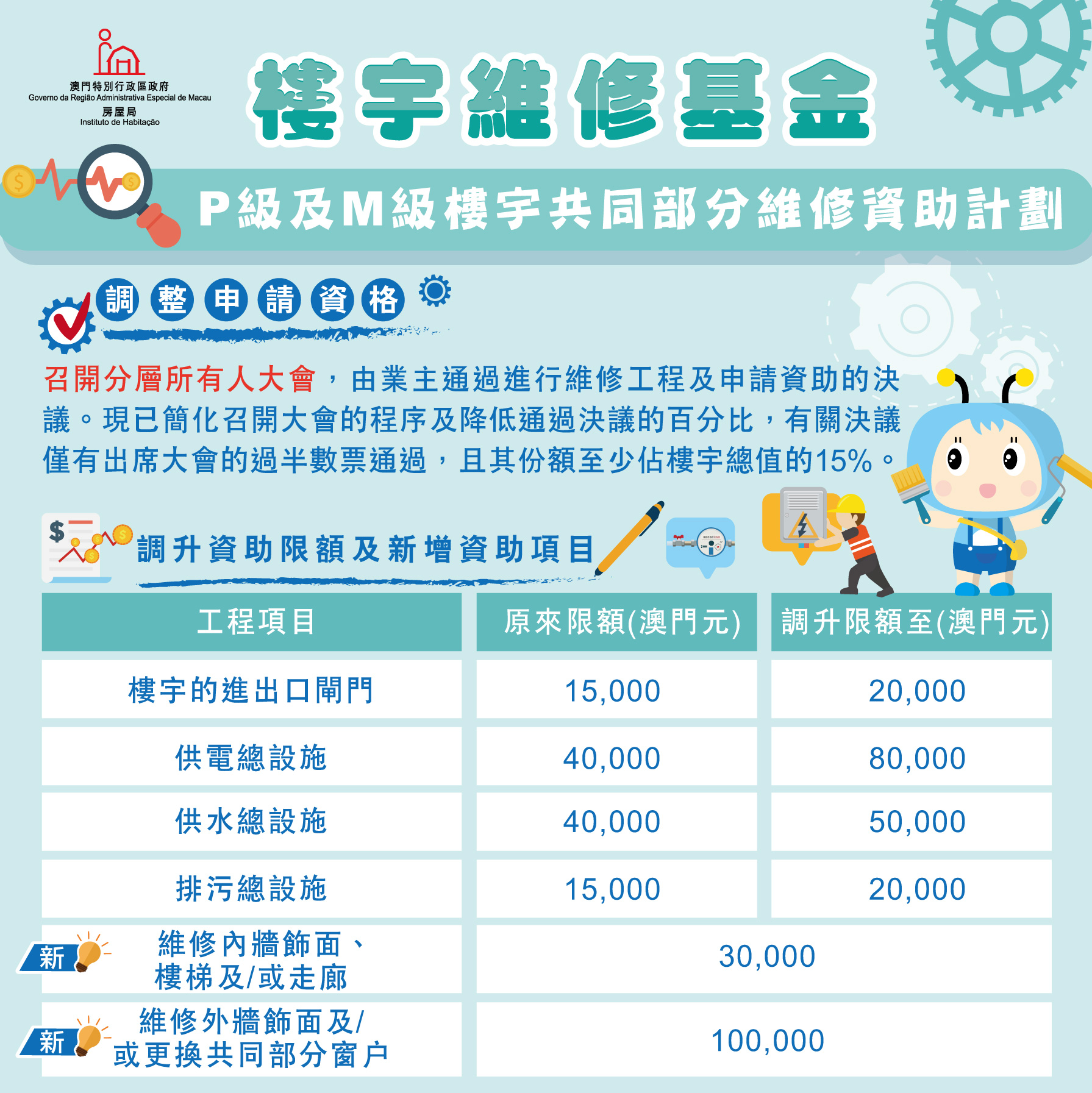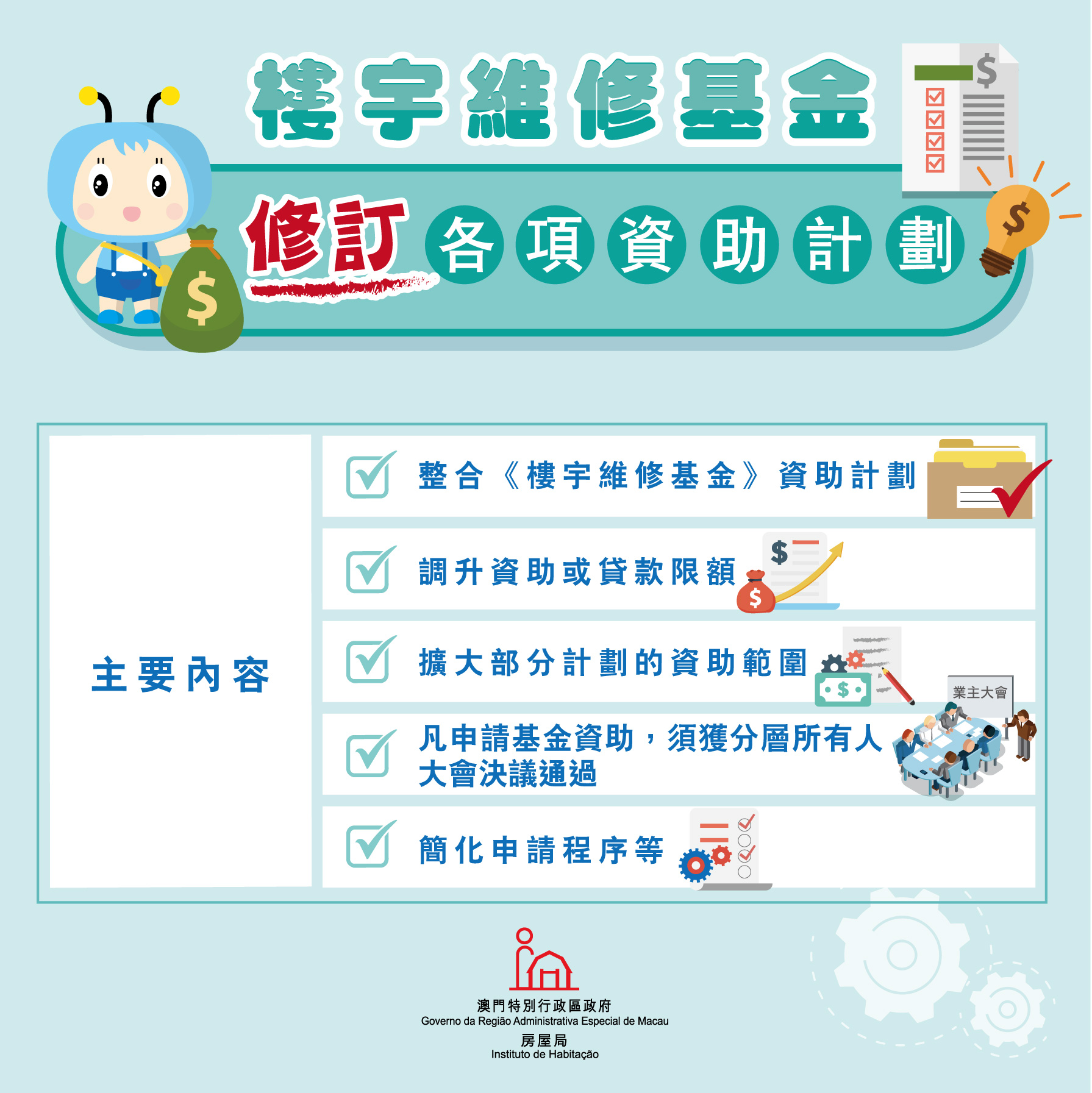 修訂後,原有的7個資助計劃規章將整合為4個,分別是“修改樓宇管理資助計劃規章”、“樓宇共同部分檢測資助計劃規章”、“樓宇維修資助及無息貸款計劃規章”和“P級及M級樓宇共同部分維修資助計劃規章”,凡申請基金資助,須由分層建築物所有人大會決議通過工程(檢測)及作出申請,申請時豁免提交已寄存於房屋局之分層所有人大會的會議錄副本,以及屬可由房屋局根據第8/2005號法律《個人資料保護法》規定透過包括個人資料互聯在內的任何方式取得的文件,以簡化申請程序。