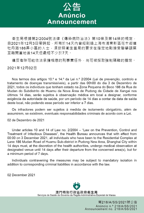 新型冠狀病毒感染應變協調中心(下稱“應變協調中心”)宣佈,因應上海市的疫情變化,衛生局根據第2/2004號法律《傳染病防治法》第10條和第14條的規定,自2021年12月3日零時起,所有於14天內曾經到過上海市浦東新區花木街道牡丹路186弄小區的人士,須按照衛生當局的要求在指定地點接受醫學觀察至離開當地後14天但最短不少於7天。已入境人士,請立即透過諮詢求助平台 https://www.ssm.gov.mo/covidq或致電28700800以便安排集中隔離醫學觀察。