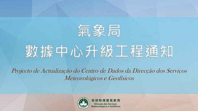 地球物理暨氣象局的數據中心將於12月4日(周六)早上9時至5日(周日)中午1時進行升級工程,以及於12月11日(周六)早上9時至下午5時進行電力維護工程,屆時氣象局網站、手機應用程式及部份資訊的發佈可能短暫受到影響,氣象局已制訂應急機制以減低對服務的影響,敬請留意。