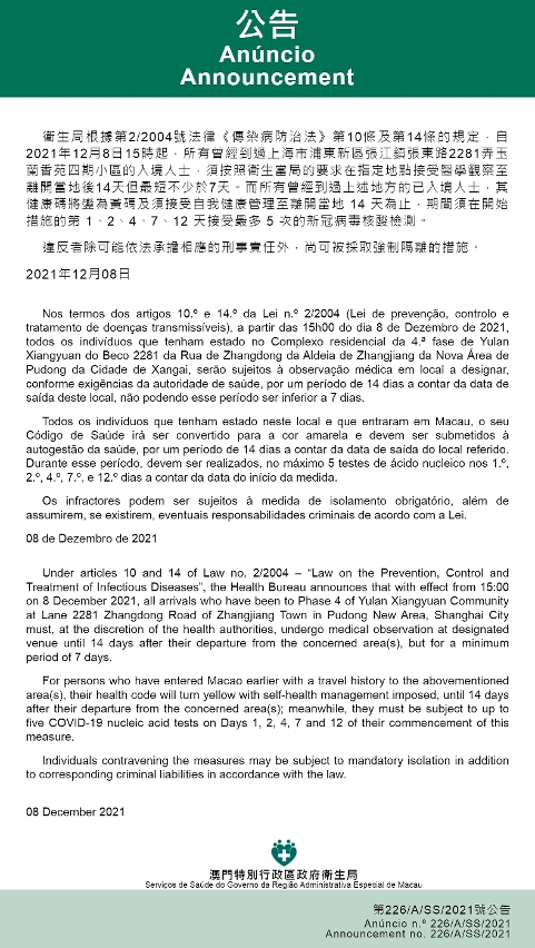 新型冠狀病毒感染應變協調中心(下稱“應變協調中心”)宣佈,因應上海市的疫情變化,自2021年12月8日下午3時起,所有曾經到過上海市浦東新區張江鎮張東路2281弄玉蘭香苑四期小區的入境人士,須按照衛生當局的要求在指定地點接受醫學觀察至離開當地後14天但最短不少於7天。而所有曾經到過上述地方的已入境人士,其健康碼將變為黃碼及須接受自我健康管理至離開當地 14 天為止,期間須在開始措施的第 1、2、4、7、12 天接受最多 5 次的新冠病毒核酸檢測。免費核酸檢測預約連結為https://app.ssm.gov.mo/mandatoryrnatestbook。核酸檢測結果不會上載至澳門健康碼亦不可作為出入境用途。如需將核酸檢測結果在澳門健康碼顯示,則須自費檢測。