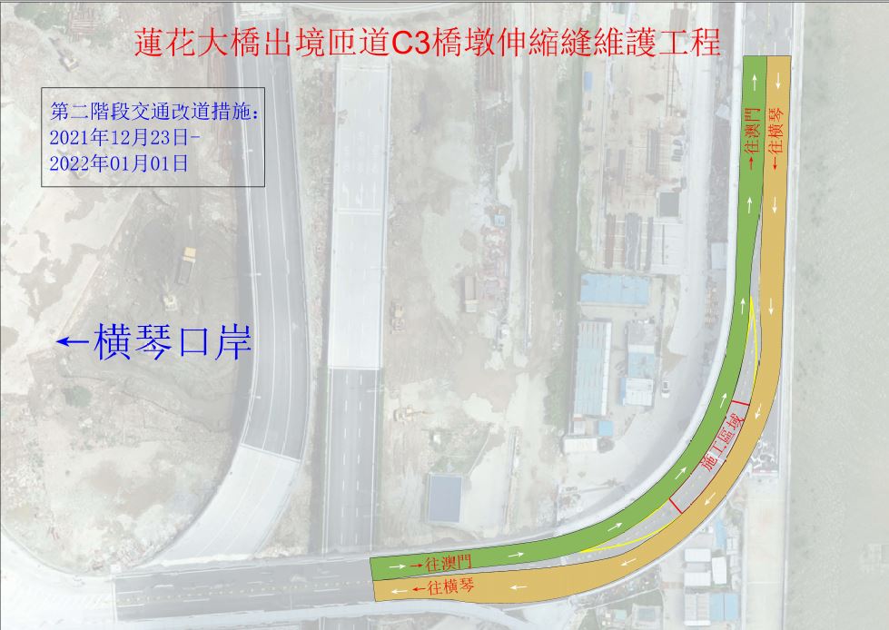 為配合蓮花大橋澳門出境匝道C3橋墩伸縮縫維護施工,出境匝道近C3橋墩的路段將分時段實施下列臨時交通措施: