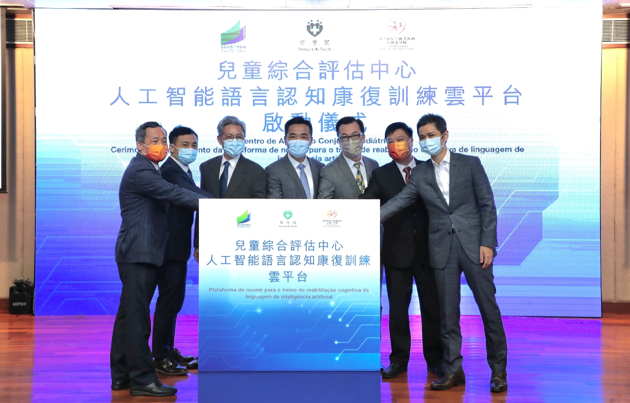 由衛生局、教育及青年發展局、社會工作局、發展障礙兒童關愛網絡共同主辦的人工智能語言認知康復訓練雲平台啟動儀式於今(30)日在黑沙環衛生中心舉行,主禮嘉賓衛生局羅奕龍局長、仁伯爵綜合醫院郭昌宇院長、社會工作局鄧玉華副局長、教育及青年發展局非高等教育 黃嘉祺廳長、暨南大學醫學部主任梁明浩教授、暨南大學附屬第一醫院康復科主任陳卓銘教授及早療康復跨部門協作組協調員戴華浩醫生共同主持啟動儀式。
