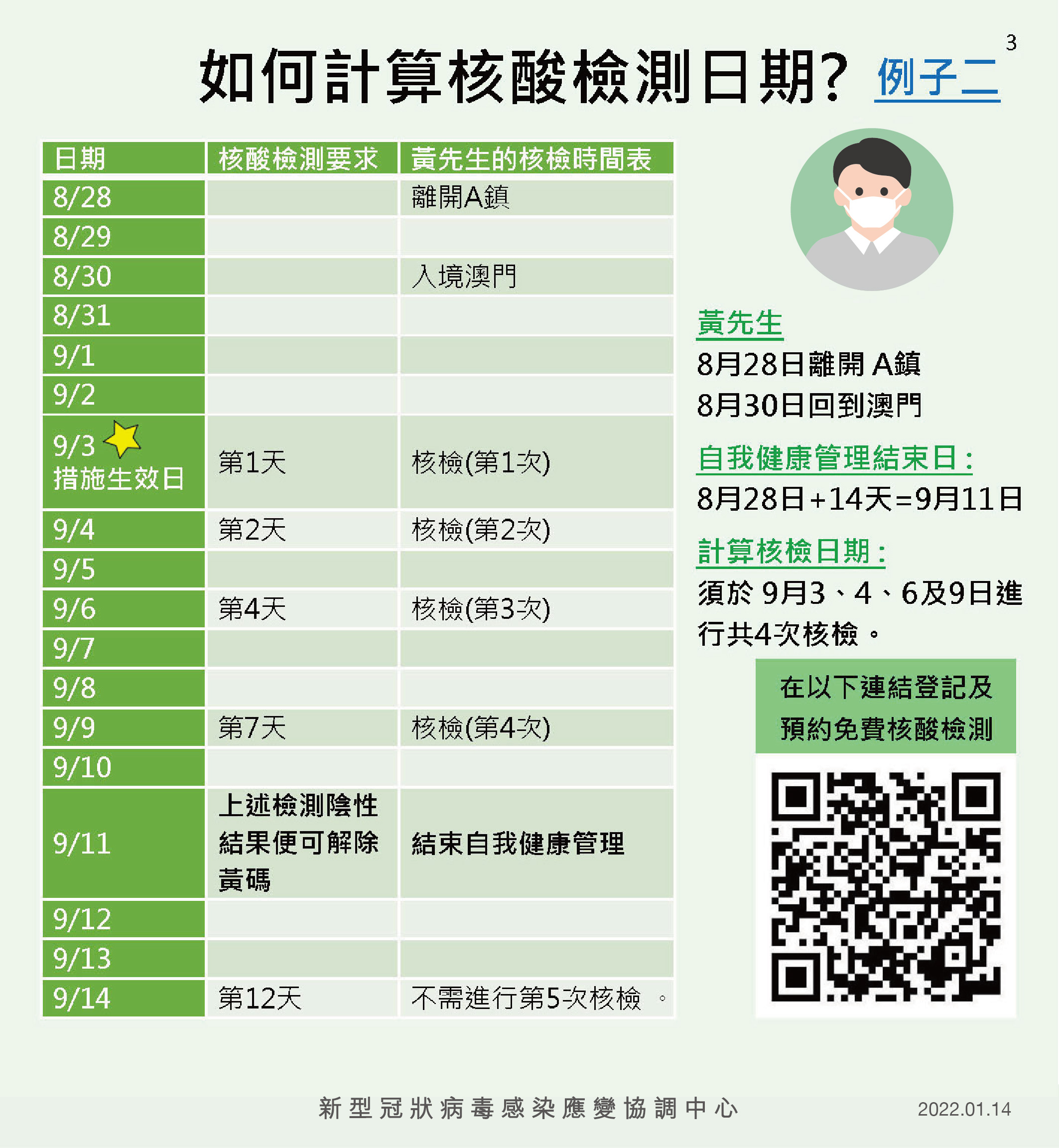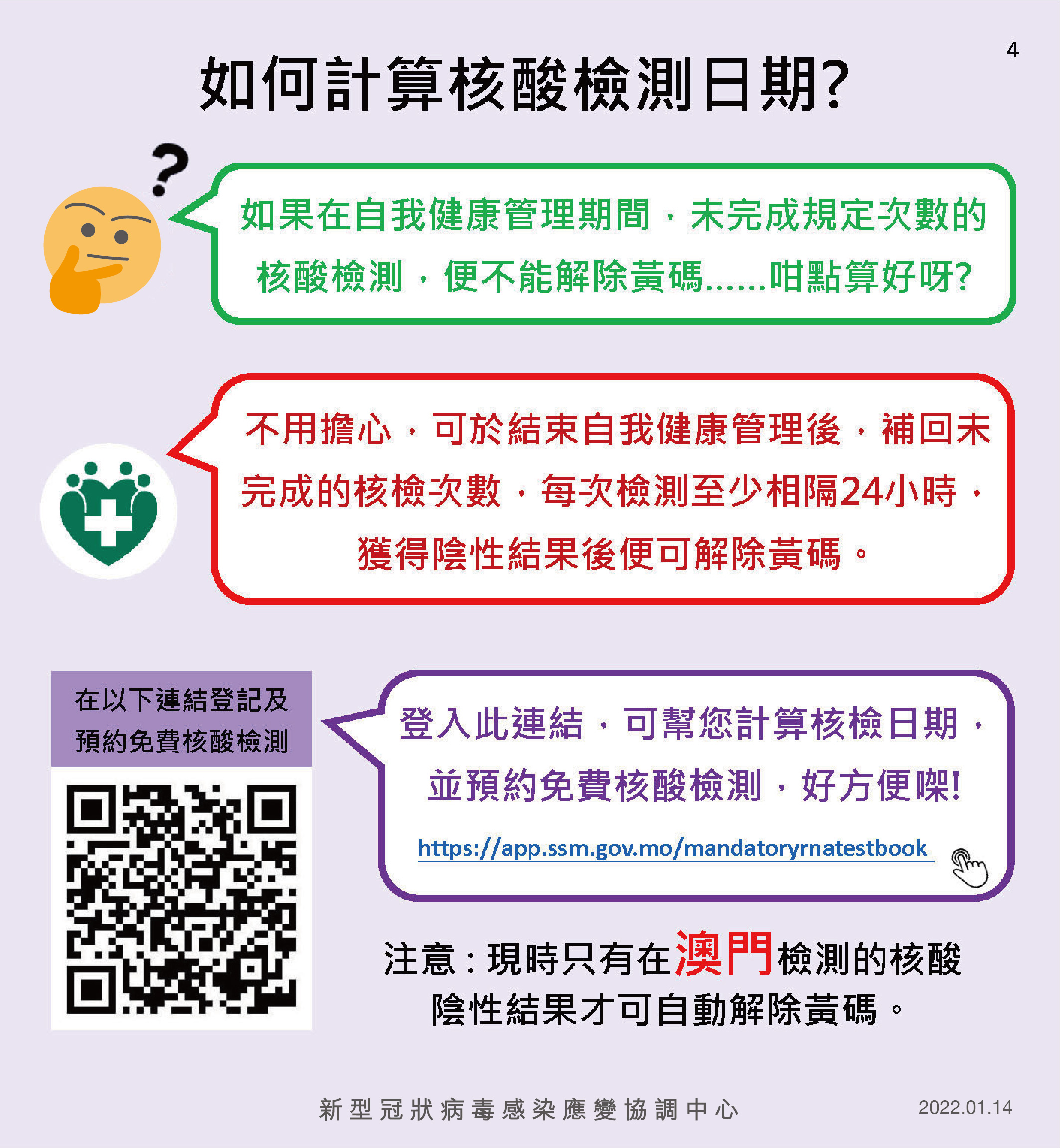 免費核酸檢測預約連結為 https://app.ssm.gov.mo/mandatoryrnatestbook 。核酸檢測結果不會上載至澳門健康碼亦不可作為出入境用途。如需將核酸檢測結果在澳門健康碼顯示,則須自費檢測。
