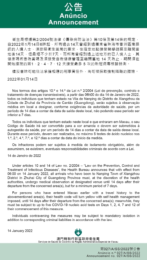 新型冠狀病毒感染應變協調中心宣佈,因應廣東省的疫情變化,衛生局根據第2/2004號法律《傳染病防治法》第10條和第14條的規定,自2022年1月14日6時起,所有過去14天曾經到過廣東省珠海市香洲區南屏鎮的入境人士,須按照衛生當局的要求,在指定地點接受醫學觀察至離開當地後14天,但最短不少於7天。而所有曾經到過上述地方的已入境人士,其健康碼將變為黃碼及須接受自我健康管理至離開當地 14 天為止,期間須在開始措施的第1、2、4、7、12 天接受最多 5 次的新冠病毒核酸檢測。免費核酸檢測預約連結為 https://app.ssm.gov.mo/mandatoryrnatestbook。核酸檢測結果不會上載至澳門健康碼亦不可作為出入境用途。如需將核酸檢測結果在澳門健康碼顯示,則須自費檢測。