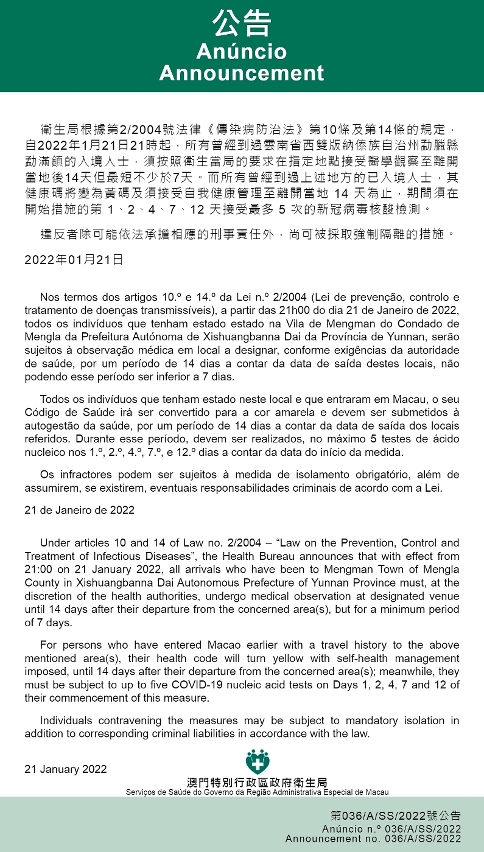 自2022年1月21日晚上9時起,所有過去14天曾經到過雲南省西雙版納傣族自治州勐臘縣勐滿鎮的入境人士,須按照衛生當局的要求在指定地點接受醫學觀察至離開當地後14天但最短不少於7天。而所有曾經到過上述地方的已入境人士,其健康碼將變為黃碼及須接受自我健康管理至離開當地 14 天為止,期間須在開始措施的第 1、2、4、7、12 天接受最多 5 次的新冠病毒核酸檢測。