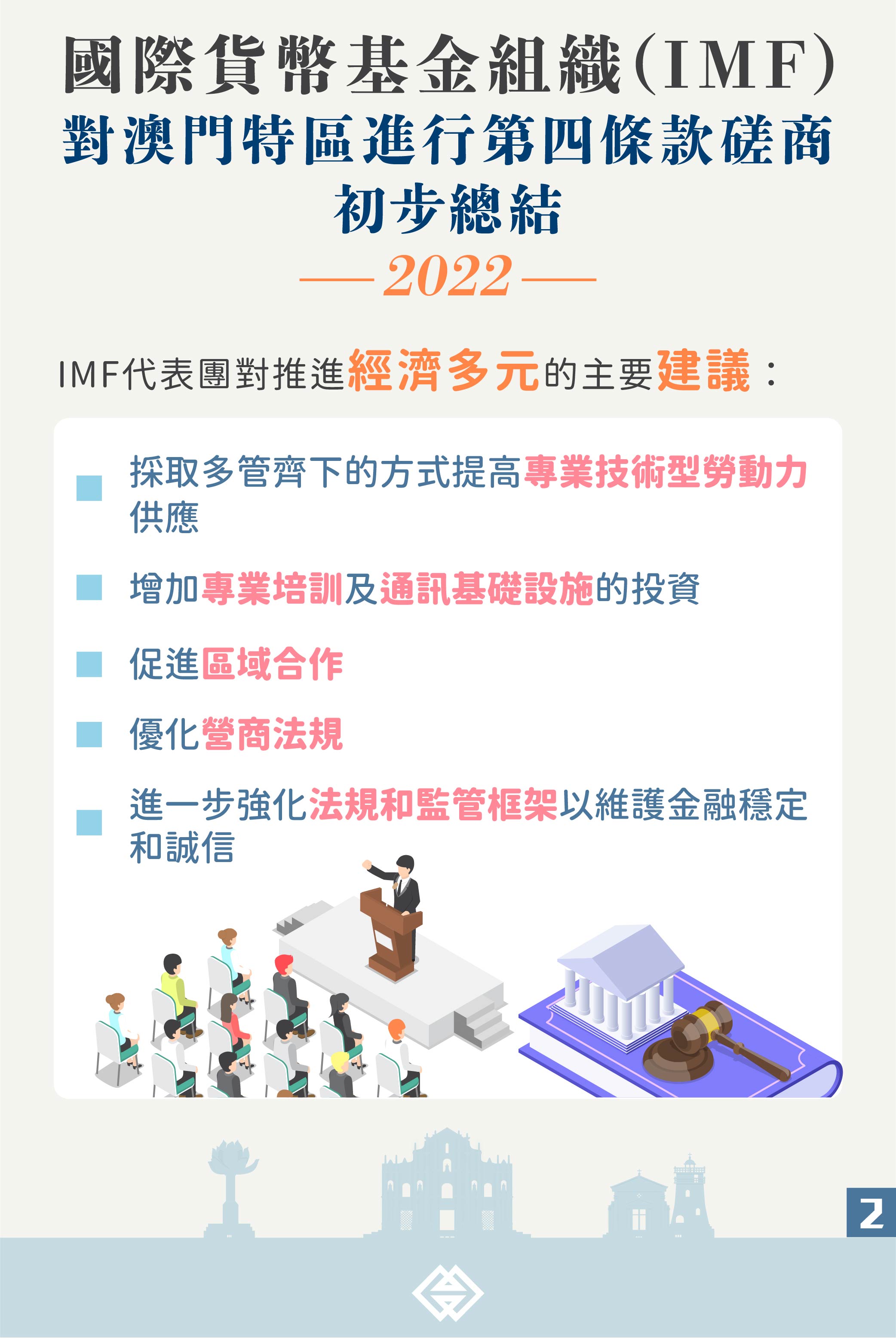 國際貨幣基金組織(International Monetary Fund,IMF)專家代表團於2022年1月10-21日期間,以視頻會議形式對澳門特區進行第四條款磋商,並就特區的宏觀經濟及金融狀況作出了初步總結。