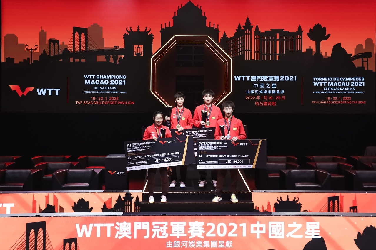 由體育局及WTT世界乒乓球職業大聯盟主辦、澳門乒乓總會協辦的「WTT 澳門冠軍賽 2021中國之星 ─ 由銀河娛樂集團呈獻」今日(23日)進行壓軸日賽事,男、女子單打冠軍最後由王楚欽及王曼昱奪得。