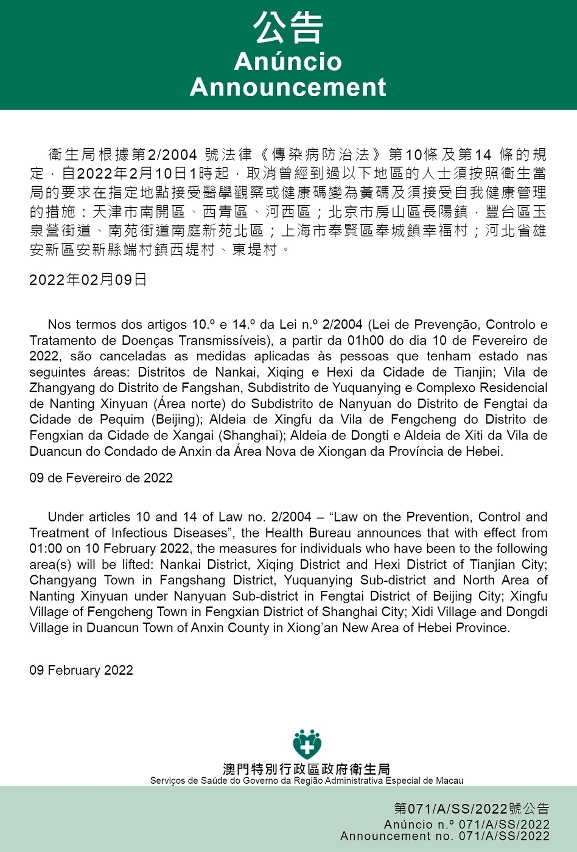 此外,自2022年2月10日凌晨1時起,取消曾經到過以下地區的人士須按照衛生當局的要求在指定地點接受醫學觀察或健康碼變為黃碼及須接受自我健康管理的措施:天津市南開區、西青區、河西區;北京市房山區長陽鎮,豐台區玉泉營街道、南苑街道南庭新苑北區;上海市奉賢區奉城鎮幸福村;河北省雄安新區安新縣端村鎮西堤村、東堤村。