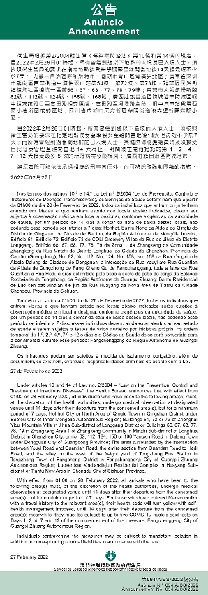 新型冠狀病毒感染應變協調中心(下稱應變協調中心)宣佈,因應內地的疫情變化,衛生局根據第2/2004號法律《傳染病防治法》第10條和第14條的規定,自2022年2月28日凌晨1時起,所有曾經到過以下地點的入境及已入境人士,須按照衛生當局的要求在指定地點接受醫學觀察至離開當地後14天但最短不少於7天:內蒙古自治區呼和浩特市、包頭市青山區青福鎮北區;廣東省深圳市龍崗區吉華街道中海怡翠山莊第54棟、第72棟、第73棟,龍華區民治街道樟坑社區樟坑一區第66、67、68、77、78、79棟;東莞巿大朗鎮楊新路82號、112號、124號、158號、168號;廣西壯族自治區防城港市防城區峒中鎮友誼路口至官田路相交匯處、官田路至河堤路全段、峒中汽車站貨場西面小巷所圍成的區域;四川省成都市天府新區華陽街道洛森堡新殿蝶郡小區。