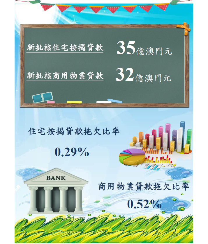 未償還商用物業貸款總額為1,622.2億澳門元,按月增加0.3%,而與一年前比較則減少2.5%;其中,居民部份佔93.6%。與一個月前比較,居民部份的未償還商用物業貸款上升0.3%,而非居民部份則下跌0.4%。