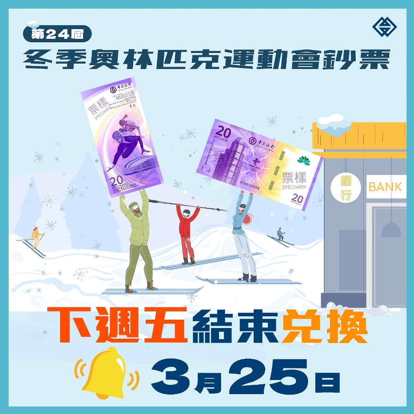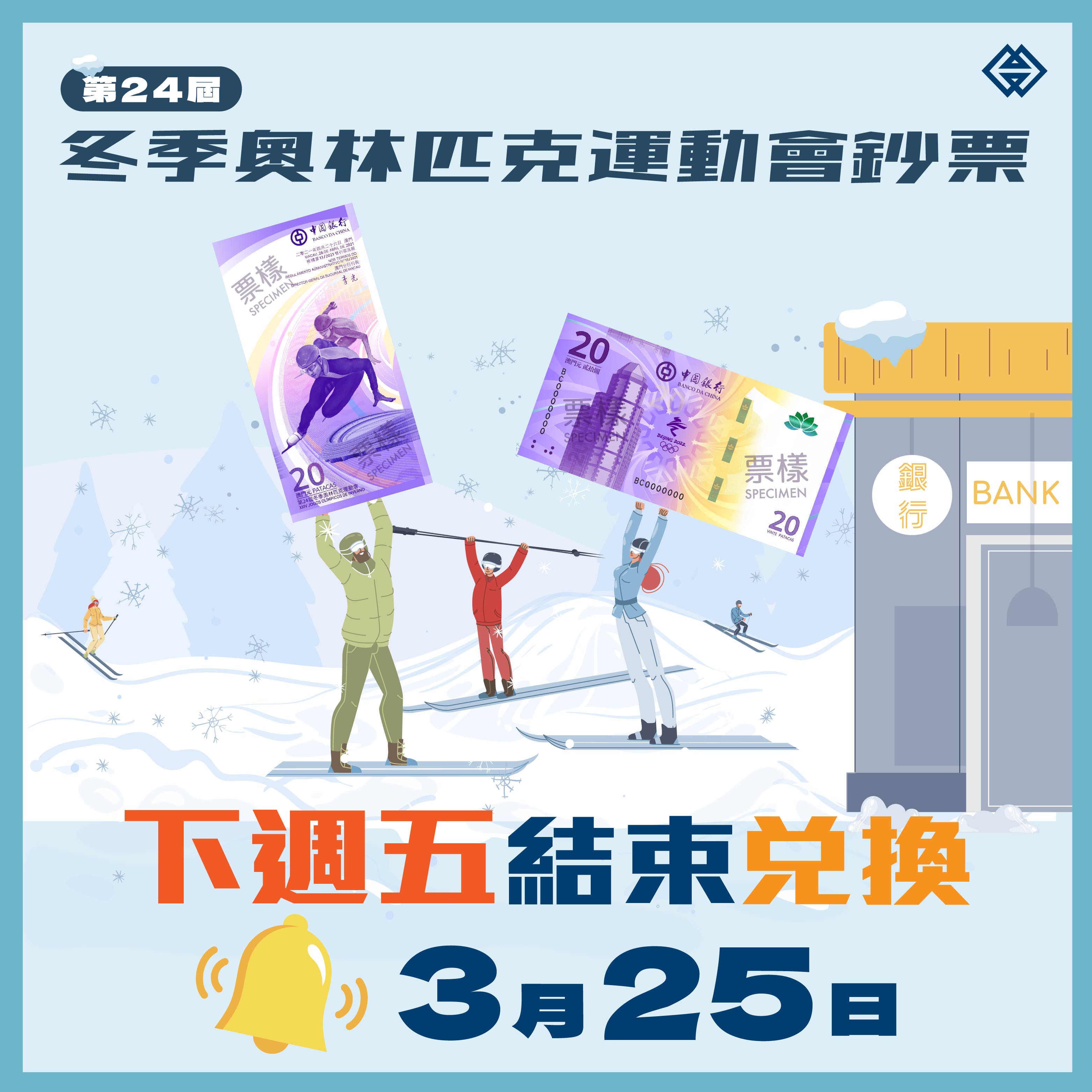 按照既定安排,第24屆冬季奧林匹克運動會鈔票的兌換期將於2022年3月25日(星期五)結束。澳門金融管理局呼籲,已完成網上登記但尚未辦理兌換的人士,請於餘下的兌換期內,前往所選定的銀行網點進行兌換。