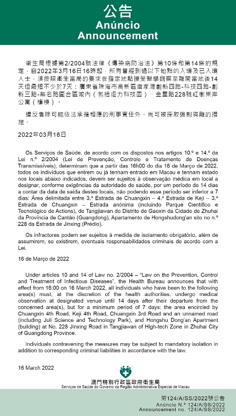 新型冠狀病毒感染應變協調中心(下稱應變協調中心)宣佈,因應內地的疫情變化,衛生局根據第2/2004號法律《傳染病防治法》第10條和第14條的規定,自2022年3月16日下午4時起,所有曾經到過以下地點的入境及已入境人士,須按照衛生當局的要求在指定地點接受醫學觀察至離開當地後14天但最短不少於7天:廣東省珠海市高新區唐家灣創新四路-科技四路-創新三路-無名路圍合區域內(包括炬力科技園)、金星路228號紅樹東岸公寓(樓楝)。