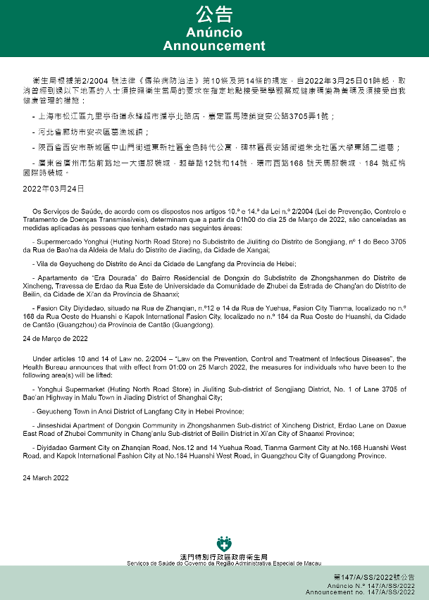 新型冠狀病毒感染應變協調中心(下稱應變協調中心)宣佈,因應內地的疫情變化,衛生局根據第2/2004號法律《傳染病防治法》第10條和第14條的規定,自2022年3月25日凌晨1時起,所有曾經到過以下地點的入境及已入境人士,須按照衛生當局的要求在指定地點接受醫學觀察至離開當地後14天但最短不少於7天:天津市東麗區金鐘街趙沽里新苑小區,西青區楊柳青鎮錦繡欣居,靜海區朝陽街道瑞和道與月緯路交口清水灣洗浴;河北省唐山市高新技術開發區盛華世家倉儲購物市場,路北區君瑞聯合農貿市場;江蘇省南京市棲霞區堯化街道下曹村99號、100號;福建省泉州市鯉城區海濱街道T淘園北至芳草嘉園、南至泉州市市政工程管理處、東至新華南路、西至芳草園公園,鯉城區鯉中街道百源社區北至龍宮巷、南至後城街、東至僑鄉商品街、西至小菜巷,洛江區萬安街道萬虹路17號、首富商城、吉源小區,泉州市晉江市池店鎮清蒙村、浯潭村、赤塘村、霞福村金福小區,晉江市陳埭鎮涵口村五四路17號;河南省周口市太康縣城關鎮建設路以西、交通路以南、原小鐵路以東、謝安路以北合圍地區,建設路北段、福興社區、原紗廠家屬院合圍地區。