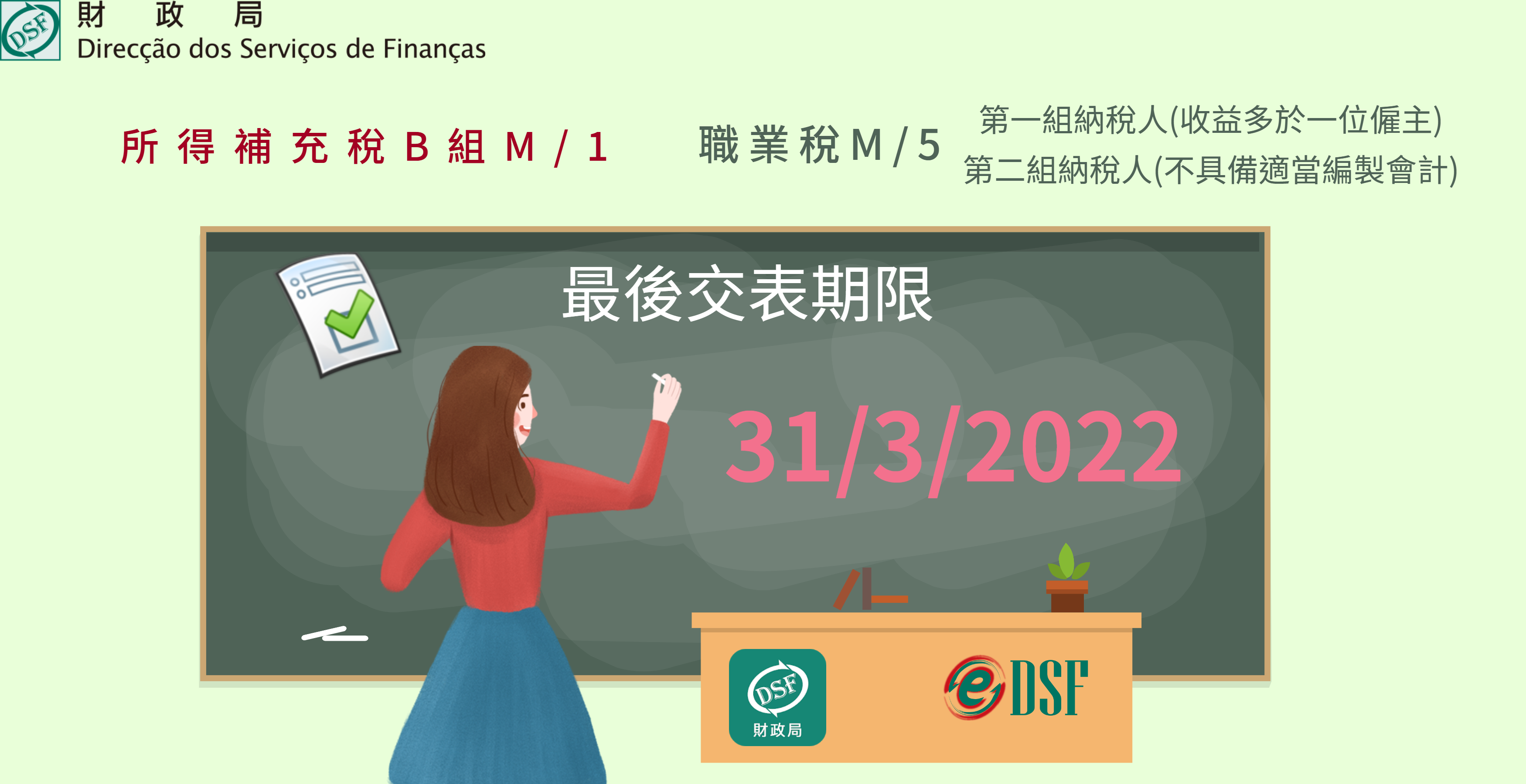 所得補充稅B組納稅人須透過所得補充稅M/1收益申報書,申報其從事工商業活動所取得的收益,而二零二一年度有關申報書的遞交期限至本年三月三十一日止。另根據第1/2022號經濟財政司司長批示,收益從多於一位僱主處獲取的職業稅第一組納稅人,以及不具備適當編製會計的職業稅第二組納稅人,二零二一年度職業稅M/5式收益申報書的遞交期限,延長至本年三月三十一日。