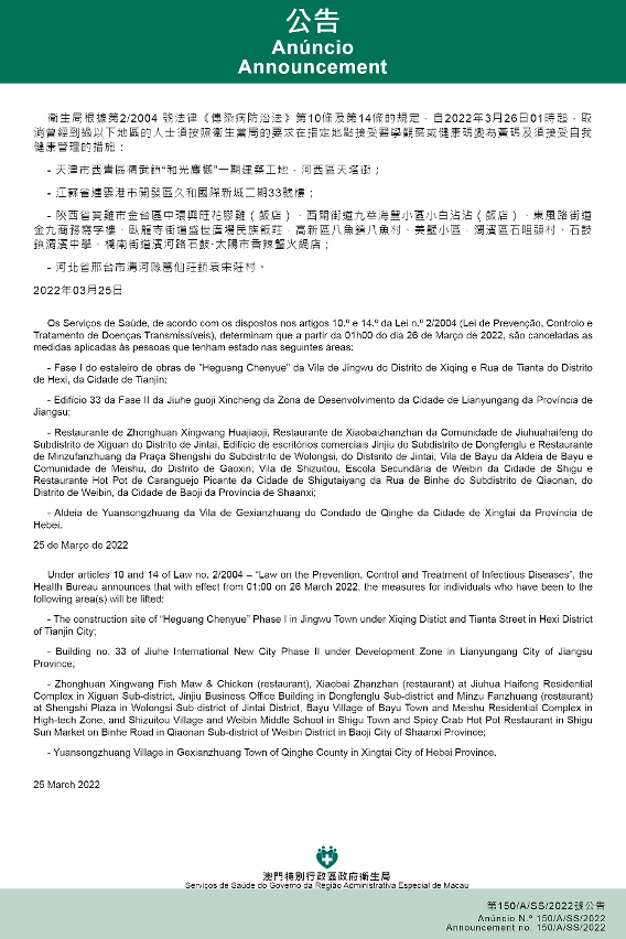 另外,自2022年3月26日凌晨1時起,取消曾經到過以下地區的人士須遵守的相關防疫措施:天津市西青區精武鎮“和光塵樾”一期建築工地,河西區天塔街;江蘇省連雲港市開發區久和國際新城二期33號樓;陝西省寶雞市的金台區中環興旺花膠雞(飯店)、西關街道九華海豐小區小白沾沾(飯店)、東風路街道金九商務寫字樓、臥龍寺街道盛世廣場民族飯莊,高新區的八魚鎮八魚村、美墅小區,渭濱區的石咀頭村、石鼓鎮渭濱中學、橋南街道濱河路石鼓·太陽市香辣蟹火鍋店;甘肅省白銀市;河北省邢台市。