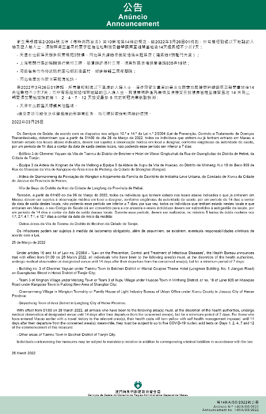 新型冠狀病毒感染應變協調中心(下稱應變協調中心)宣佈,因應內地的疫情變化,衛生局根據第2/2004號法律《傳染病防治法》第10條和第14條的規定,自2022年3月26日凌晨1時起,所有曾經到過以下地點的入境及已入境人士,須按照衛生當局的要求在指定地點接受醫學觀察至離開當地後14天但最短不少於7天:天津市北辰區天穆鎮辰美雅苑3號樓、河北區光復道街萬愛情侶主題酒店(建國道1號龍門大廈);上海市閔行區的梅隴鎮行南村三隊、華漕鎮許浦村三隊,浦東新區康橋鎮苗橋路935弄19號;河南省焦作市修武縣的王屯鄉前南孟村、城鎮辦輕工局家屬院;河北省廊坊市安次區葛漁城鎮。