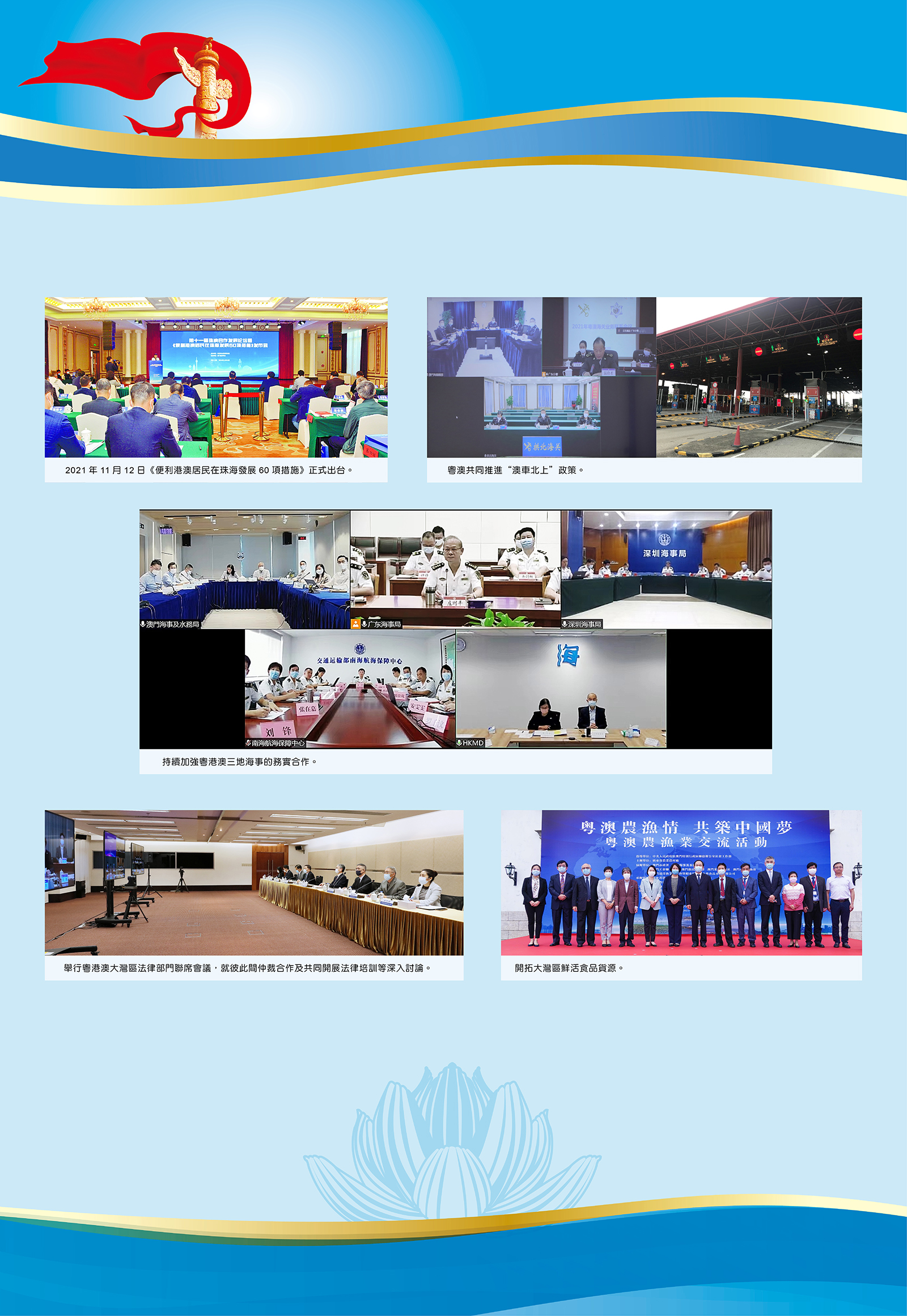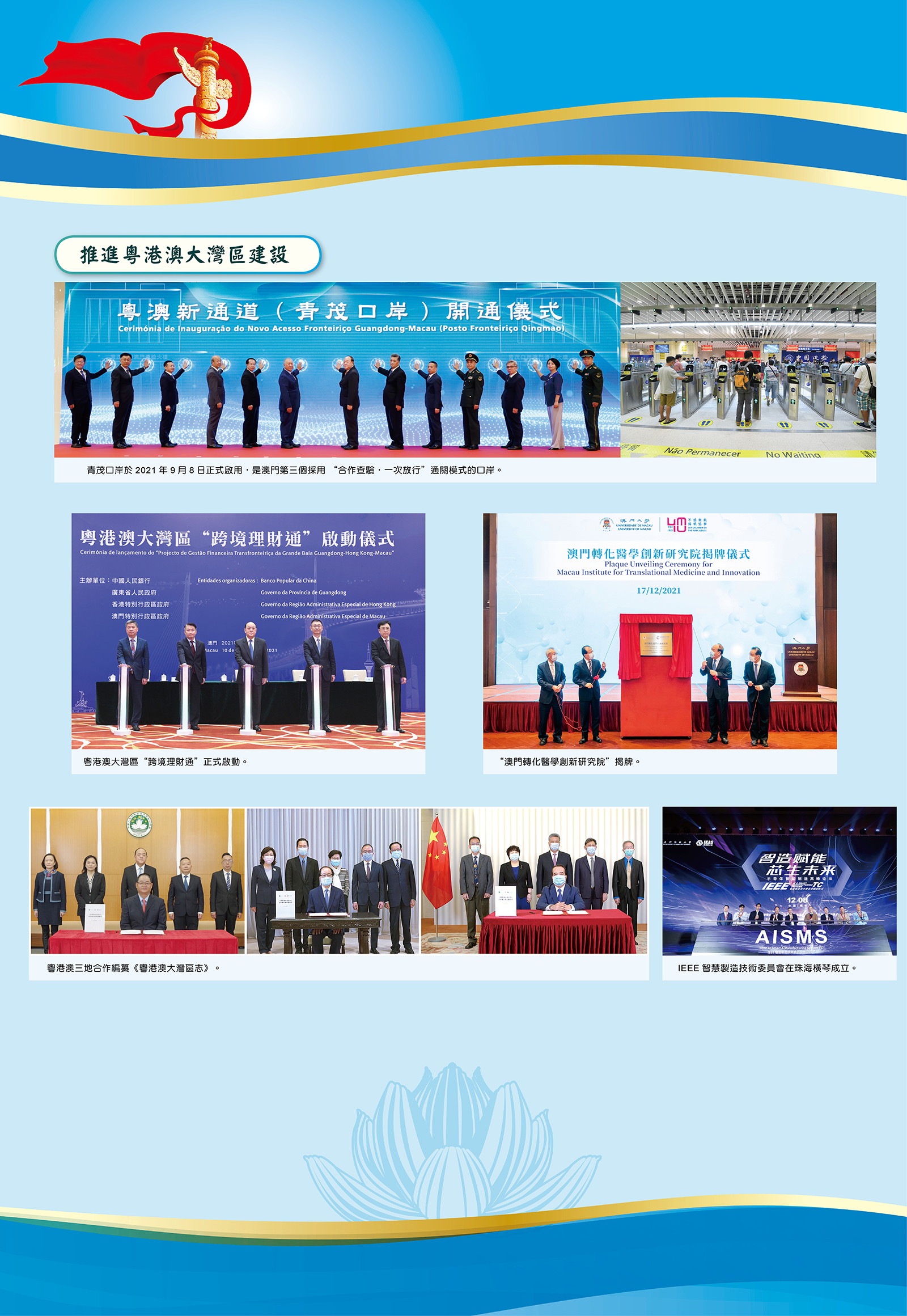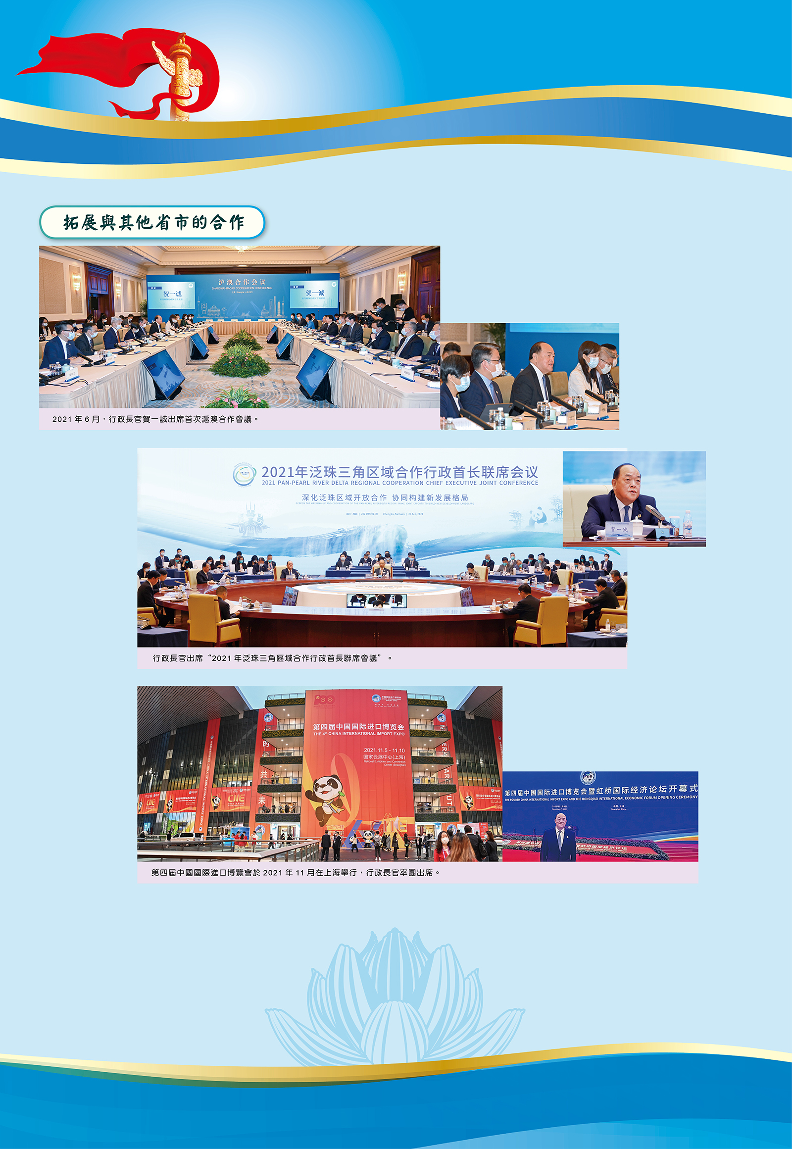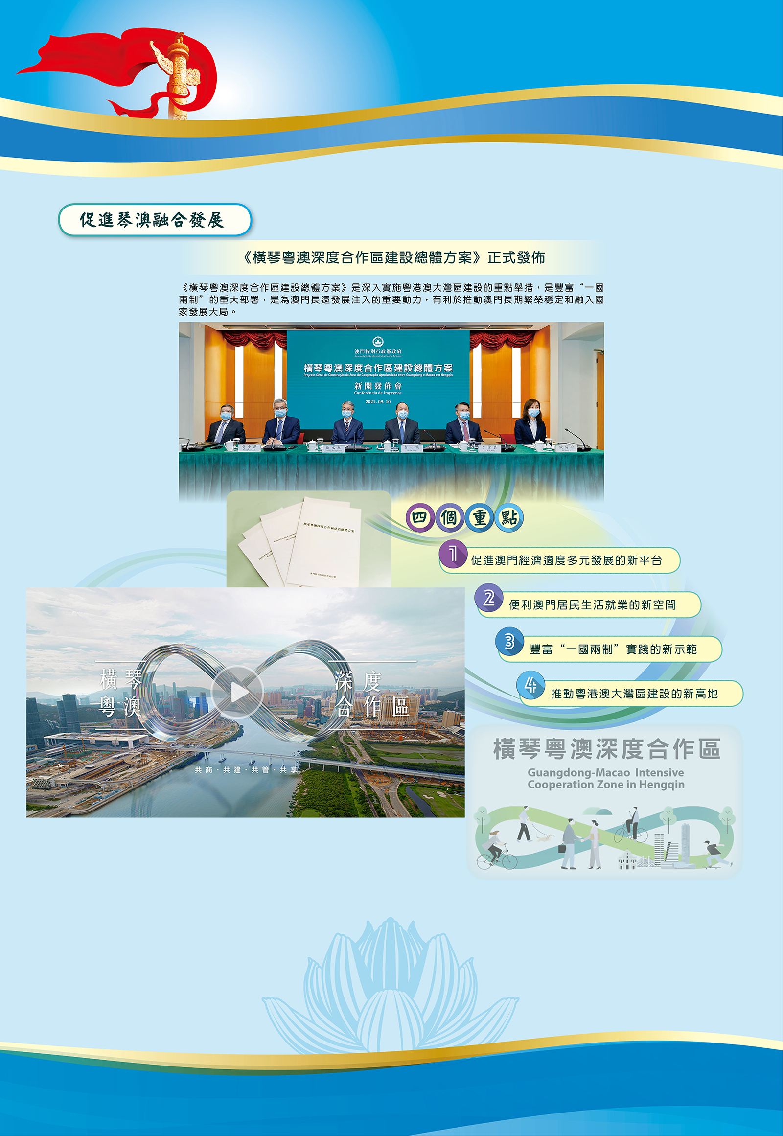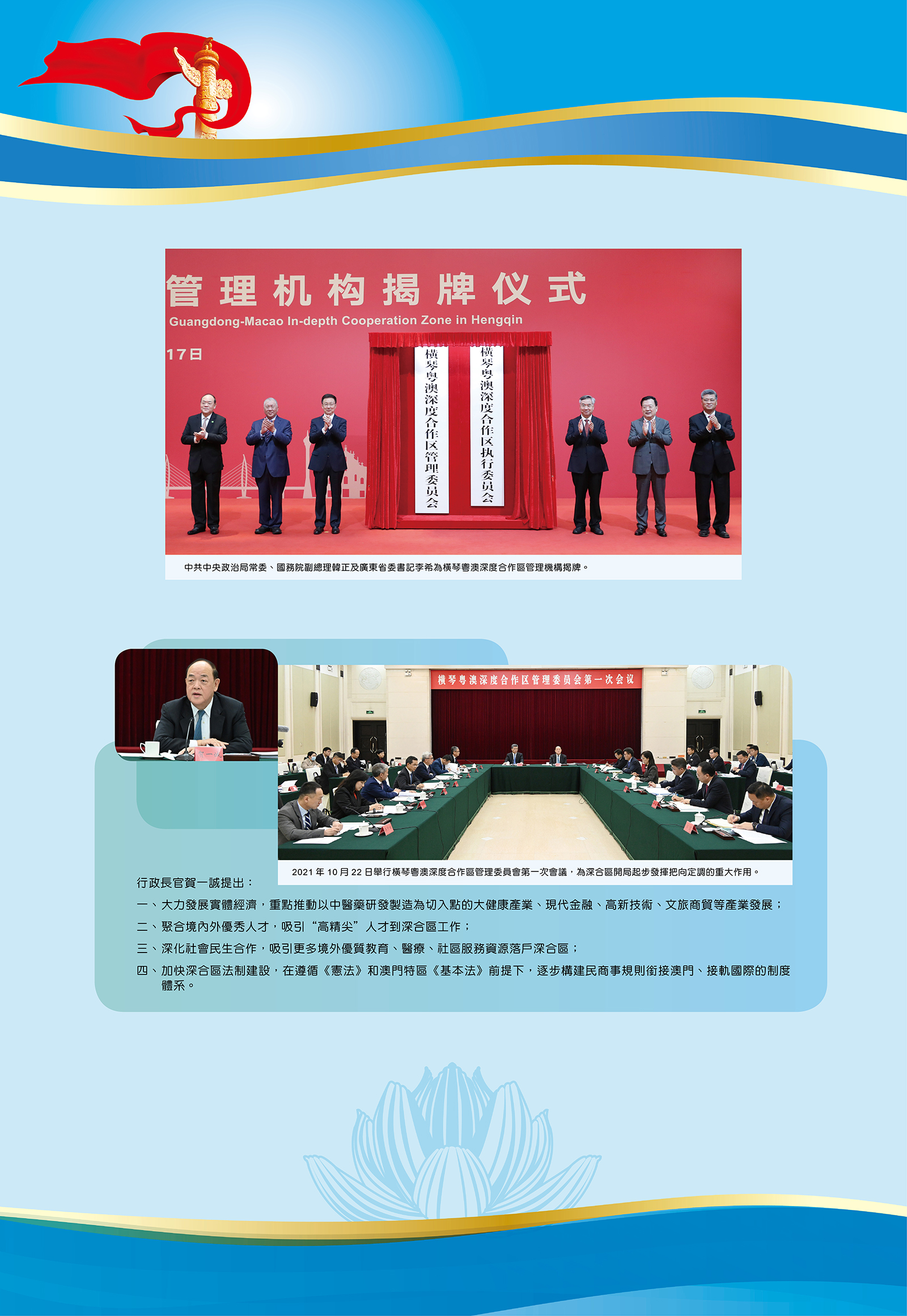 此外,該部份亦分別闡述了行政長官賀一誠於去年多次率團往內地多個城市考察訪問,拓展各省市與澳門的交流合作;為把握國家發展機遇,經廣泛聽取本澳各界人士意見,特區政府編製《澳門特別行政區經濟和社會發展第二個五年規劃(2021-2025年)》,構建未來發展藍圖,為社會提供清晰的發展方向。
