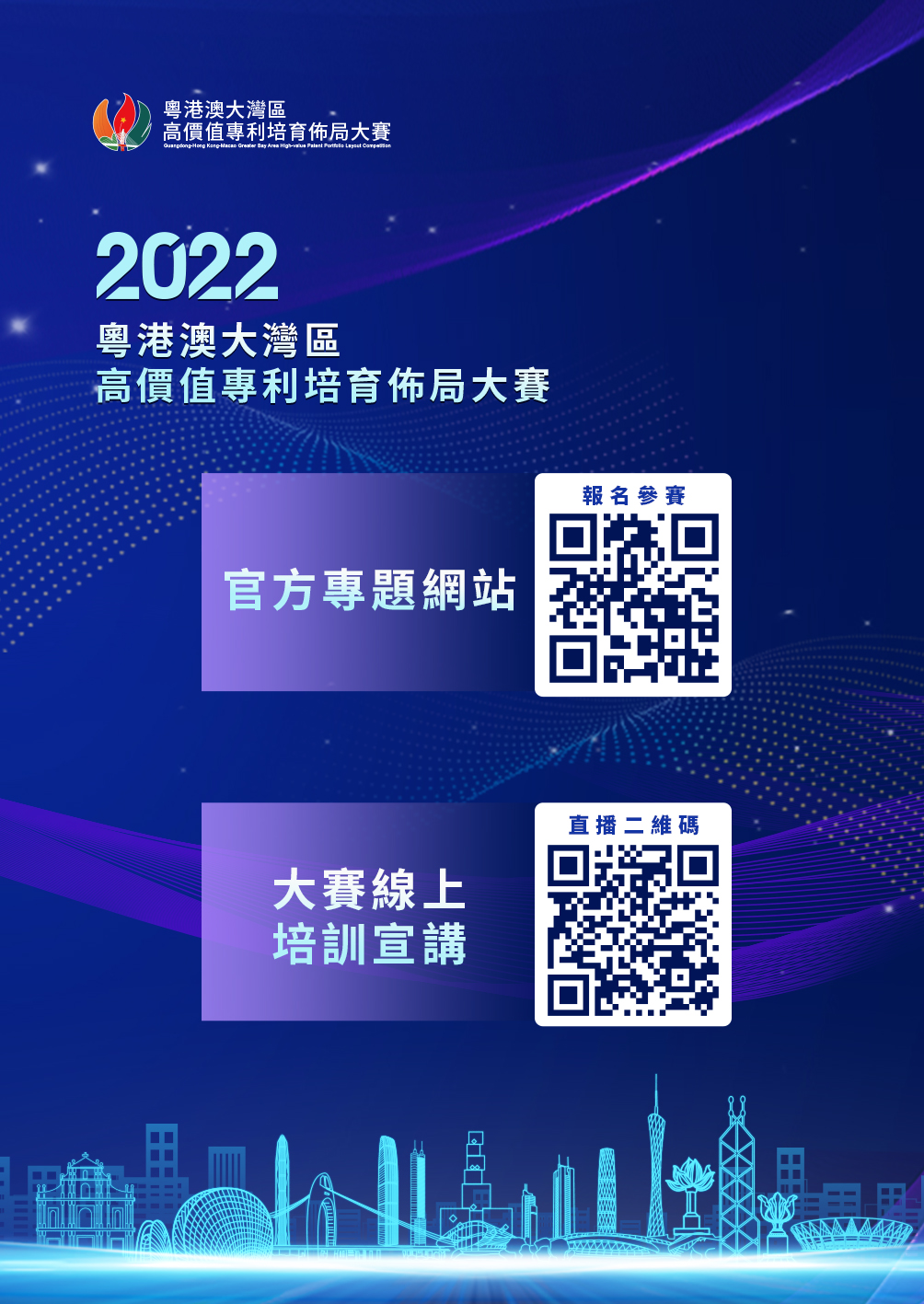 為推動粵港澳大灣區高質量發展,積極打造更完善的知識産權創造、保護和運用生態,廣東省知識產權局、香港特別行政區政府知識產權署、澳門特別行政區政府經濟及科技發展局和佛山市人民政府於2022年4月至10月聯合主辦“2022年粵港澳大灣區高價值專利培育佈局大賽”。大賽現已接受報名,報名截止日期為6月20日。為了讓公眾清晰瞭解賽事詳情,經濟及科技發展局將於5月25日舉辦大賽網上培訓宣講活動。